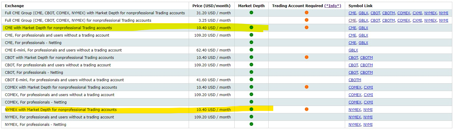 If my focus is in the ES (CME) and CL (NYMEX) market: 1. Can I opt to activate individual 'CME with Market Depth for nonprofessional Trading accounts ($10.4)' and 'NYMEX with Market Depth for nonprofessional Trading accounts ($10.4)' option, instead of the 'Full CME Group (CME, CBOT, COMEX, NYMEX) with Market Depth for nonprofessional Trading accounts Symbols ($31.2)' package? (screenshot attached) 2. Doing the above would still give me the same live data for the ES and CL market, yes? Thank you! Chin |
