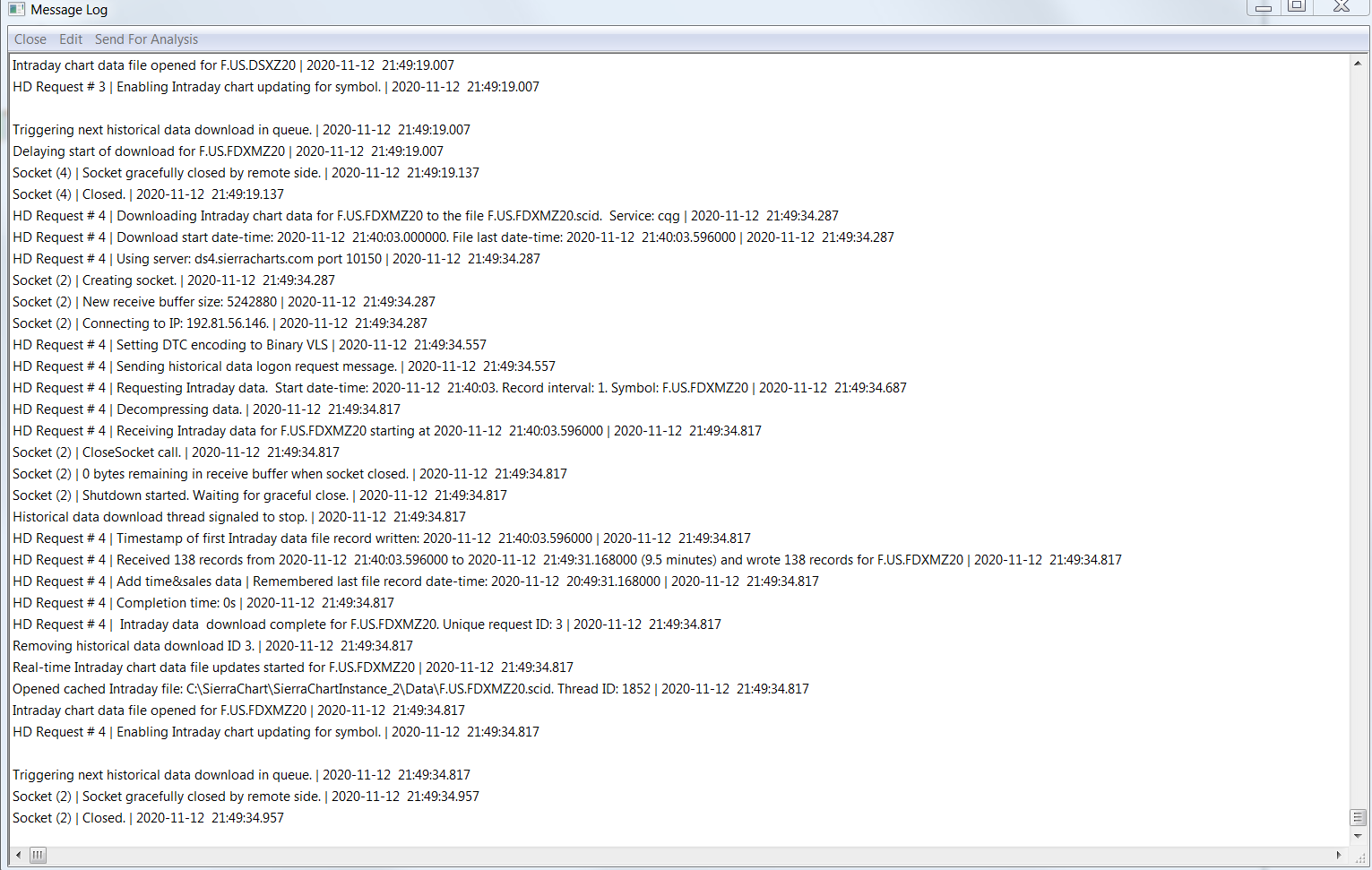 I did flush the DNS, BUT this does not solve the connecting issue with CQG. BUT in addition I opened an sub instance and the sub instance could load the latest chart data, but it does not refresh automatically. So if I close the sub instance and reopen again the latest data of all sub instance charts get loaded. However this does NOT work with the main instance! The sub instance message log are attached. So it seems that in some way the data can be receive but not automatically and not with the main instance ! Can you check this for me ? |