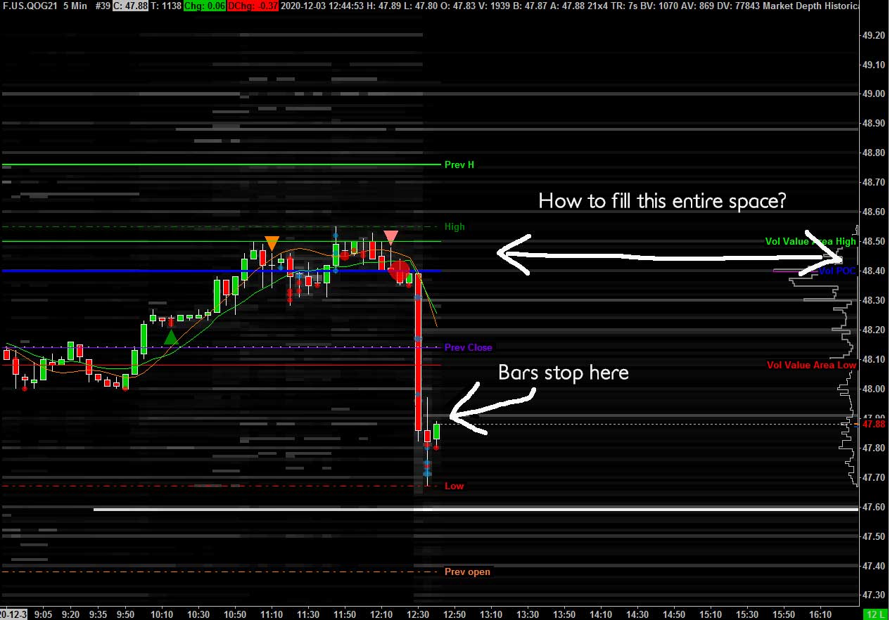 Hi, The bars on the chart stop half way as if there was an invisible margin. Please see attached pic for a clear example. I would like to have the bars go across the chart and populate it normally till they reach the right hand side where the price levels are. It's the first time i have come across this issue, i have checked the scale settings against other charts i have, but to no resolve. How can this be done? Date Time Of Last Edit: 2020-12-03 10:14:03