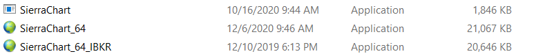 I have two instances of SC running so I compared the two main folders with the executables. In the instance that works without issues there are two green icons named SierraChart and SierraChart_64. In the other folder (the one not working) There are three applications. I attached an image. I tried opening the application that does not have the normal icon. Its only 1,846 kb and it works normally. It is version 2207. The only thing missing when I open the app are my DTS username and password settings for IB. When I installed this instance of SC I did something wrong (renaming the exe?) I dont want to change anything as I am concerned I will make it worse so I will wait for you to advise me on renaming or deleting the application files. |