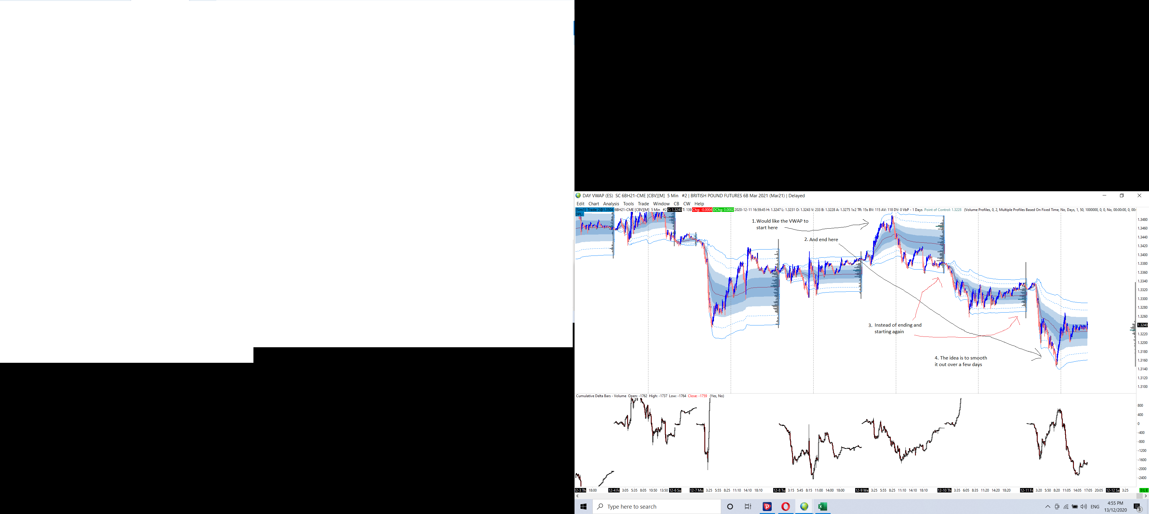 As you will see from the screenshot, I want to smooth out the VWAP so I can choose when the VWAP starts and a new session begins. Currently its starting and stopping too soon. Would love to know how to extend the session out over a few days as obviously some trends can go for a few days+ at times. Thanks Dave |