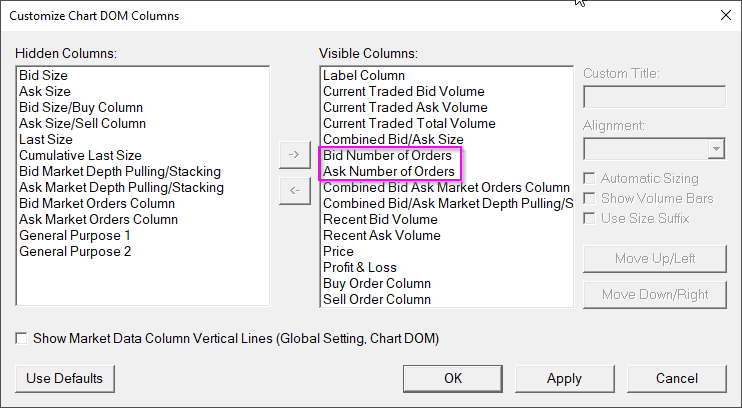 Can a "Combined Bid/Ask Number of Orders" Column also be added in a future release? Currently, only the separate Bid and Ask Number of Orders columns are available for use in the Chart DOM. Thank You |