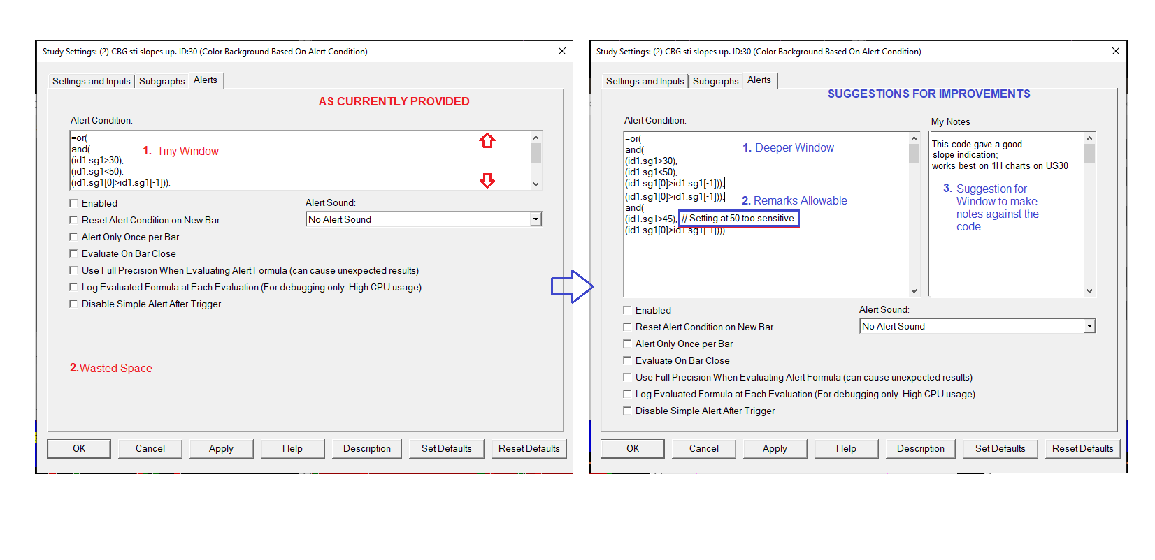 Hi Sierra, I think Sierra is a great tool, but does have its quirks that could, I believe, benefit others by simple changes. My suggestion is a change of format of the Studies Window to include: 1. A deeper 'Studies To Graph - Alerts' window so I can see the code I am writing without having to peer at it through a letter box 2. The facility to add remarks after my code - for example: -=(id1.sg1>50)// or Rem "This setting was too sensitive on 45" 3. Add a separate window for 'My Notes'. I write many pieces of code but I do not want to have to copy and paste to a WORD file etc each time I have added a PNG file as a working example Thanks - Mark B |