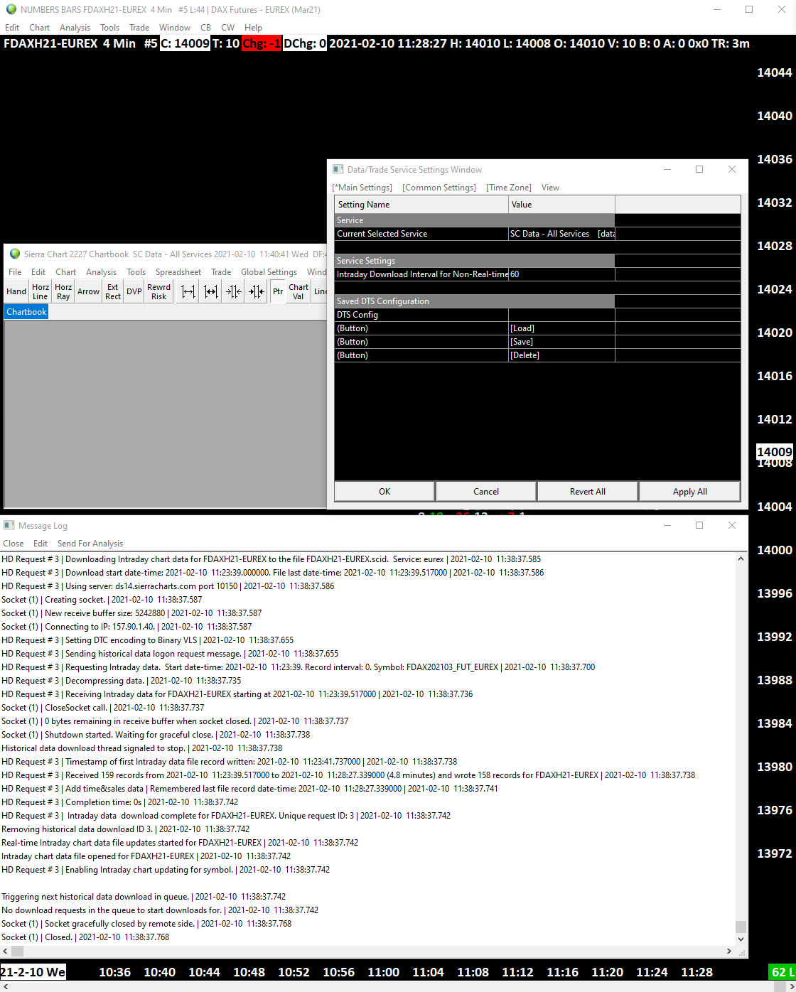 I've enabled the Denali data feed and followed the instructions to set up real time data feed for the EUREX Dax futures market. However I'm not getting any real time data coming through. It appears to only be historic data. There is no [M] next to the symbol as well. I was previously using IQFeed before switching over to SC Data - All Services. The symbol when using IQFeed for the Dax market is XG# whereas when using SC Data - All Services feed the symbol is FDAXH21-EUREX. Unfortunately when selecting translate symbol to current service it doesn't work. I have to manually change the symbol. In any case even once manually changed it still doesn't work. I've tried following the Sierra Chart Software Instructions section but it still doesn't work - Denali Exchange Data Feed: *Setup Instructions: CME/CBOT/NYMEX/COMEX Exchanges* Attached is a screenshot. Date Time Of Last Edit: 2021-02-10 12:06:31