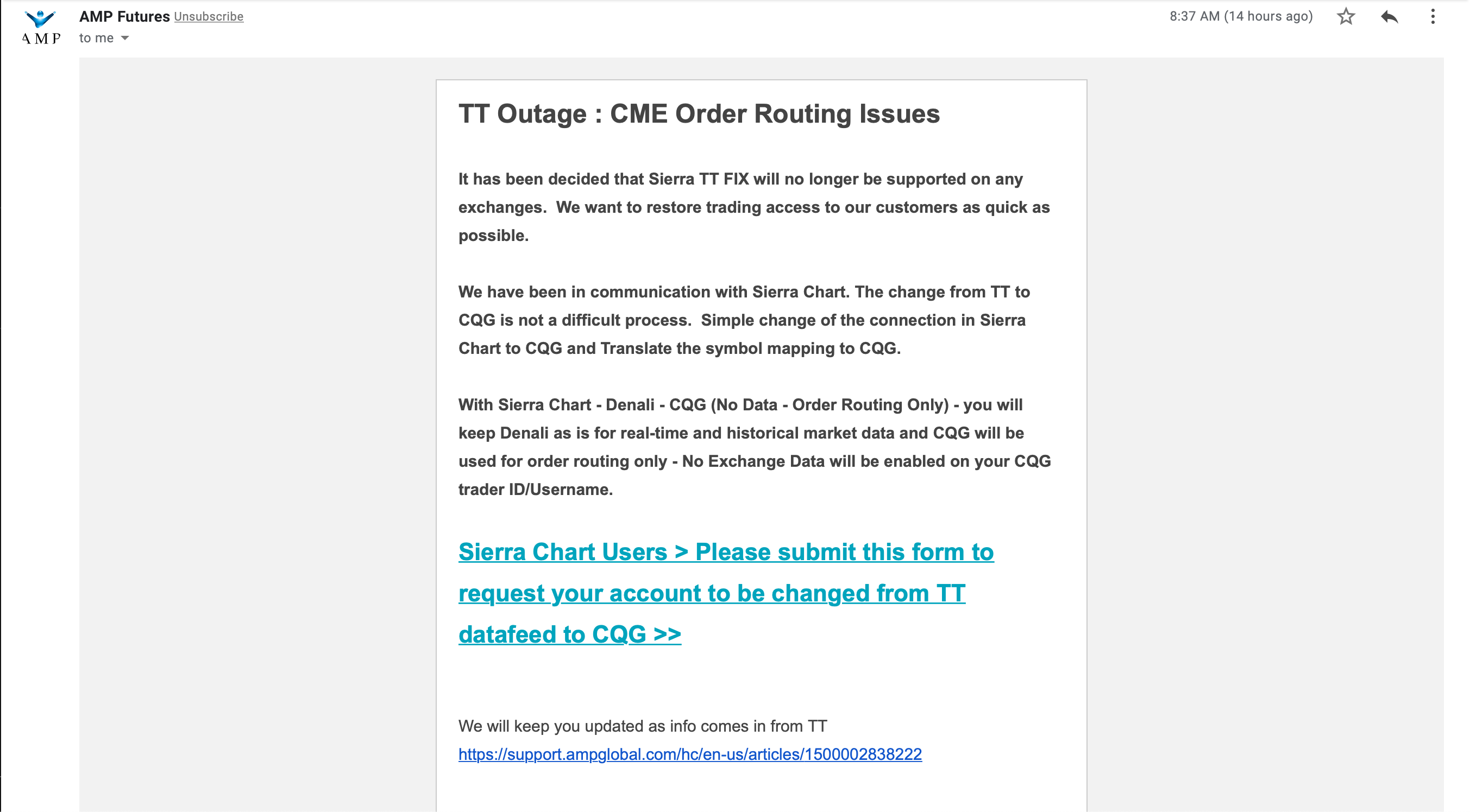 About the attachments, got it = uploaded the attachment again so visible to all So if AMP or no exchange is supporting the TTFix so will I have to select, Sierra Chart (platform) - Denali (data) - CQG (order routing)? If I change my data and order routing to CQG, does that mean Sierra Chart will not support any technical issues? But if I keep data as Denali and only do order routing through CQG this is supported by Sierra Chart? Just trying to figure out impact of the options of keeping Sierra Chart as trading platform: option 1 - Denali (data) and CQG (order routing) option 2 - CQG (data + order routing) Clarification on this will be helpful |