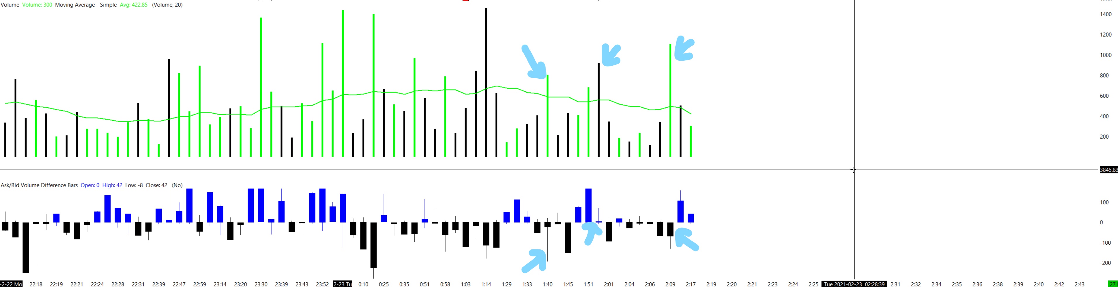 I am attaching another study, this one is the Ask/Bid Volume Difference Bars, compared with the Volume study. I picked 3 examples, but there are way more. So please, could you explain to me why I see this huge difference? Am I using the studies wrong? Do I have a wrong expectation? As I understand if Ask volume > Bid Volume => volume bar should be green. |