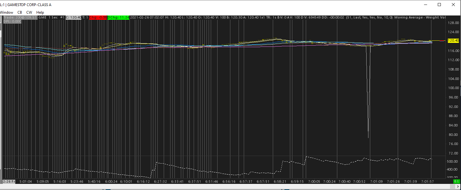 if you look at the picture. Sometimes it give me those spike. Its for the Moving Average - Weight Volume Move-Adjusted It happen only on my 1s chart and with the 8 MA maybe it happen on other X Ma Time frame and date on the picture 7:00:59 , on GME Other Example , 25 FEB 15:50, 100 tick chart. SPY 26 FEB at 9:01:51, 1 second chart. LIXT 26 FEB 9:05 to 9:20 , 1 sec chart , 8 MA and 13 MA , GTES thanks in advance. Date Time Of Last Edit: 2021-02-26 15:07:44