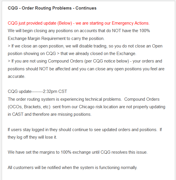 CQG - Order Routing Problems - Continues CQG just provided update (Below) - we are starting our Emergency Actions. We will begin closing any positions on accounts that do NOT have the 100% Exchange Margin Requirement to carry the position. > If we close an open position, we will disable trading, so you do not close an Open position showing on CQG > that we already closed on the Exchange. > If you are not using Compound Orders (per CQG notice below) - your orders and positions should NOT be affected and you can close any open positions you feel are accurate. CQG update--------2:32pm CST The order routing system is experiencing technical problems. Compound Orders (OCOs, Brackets, etc) sent from our Chicago risk location are not properly updating in CAST and therefore are missing positions. If users stay logged in they should continue to see updated orders and positions. If they log off they will lose it. We have set the margins to 100% exchange until CQG resolves this issue. All customers will be notified when the system is functioning normally. |