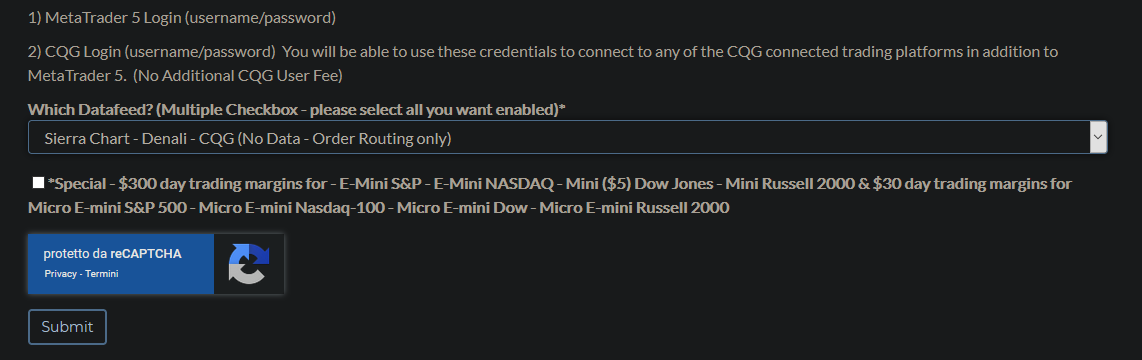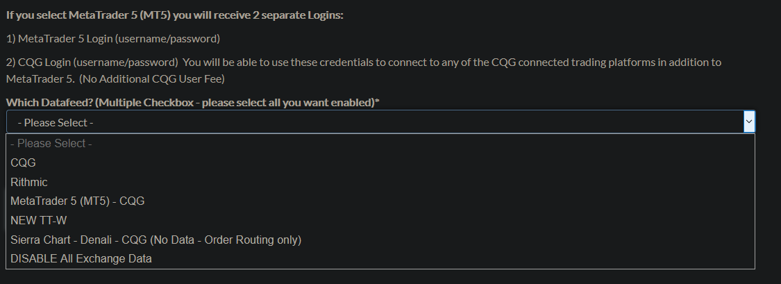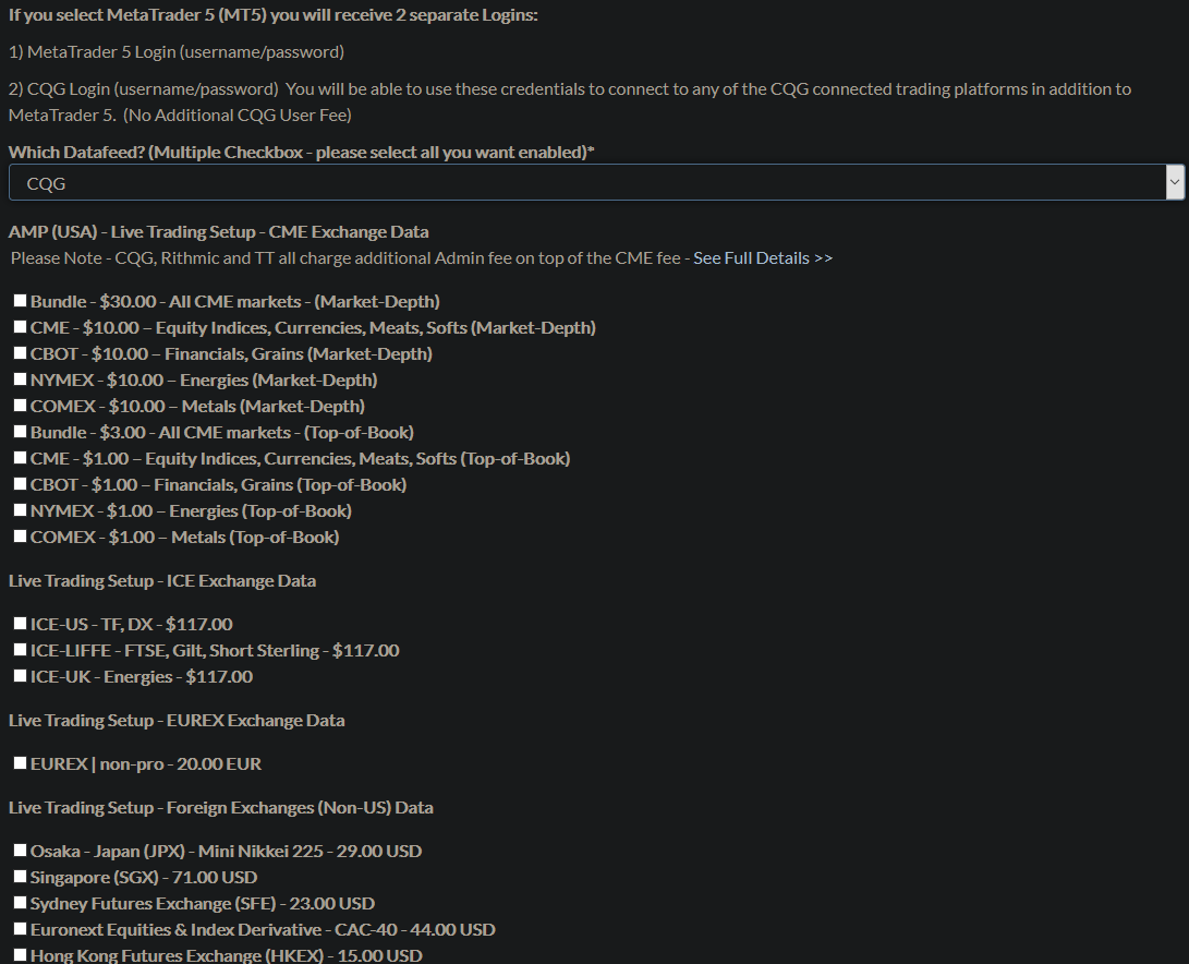 Selecting "Sierra Chart - Denali - CQG (No Data Order Routing Only)" As you can see in the picture no selection options for the Market Data Exchange Fees, so I assume is this. Selecting only CQG instead come out the options, as you always see in the picture, so not this. All right? |