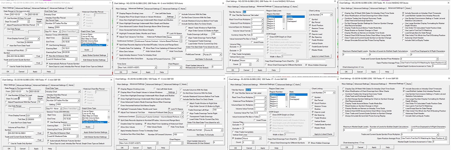 Hi Guys, For the longest time I have this issue of SC not recording Number of Traders Per Bar during offline. However, there seems to have no issue recording NQ even if it is offline. Is there a work around to record bars based on specific number of trades even when I am offline? I attach chart settings comparison of NQ vs ES, everything seems to be the same except that I use 2000 trades per bar to record NQ. What did I miss? Thanks in advance for the help. |
