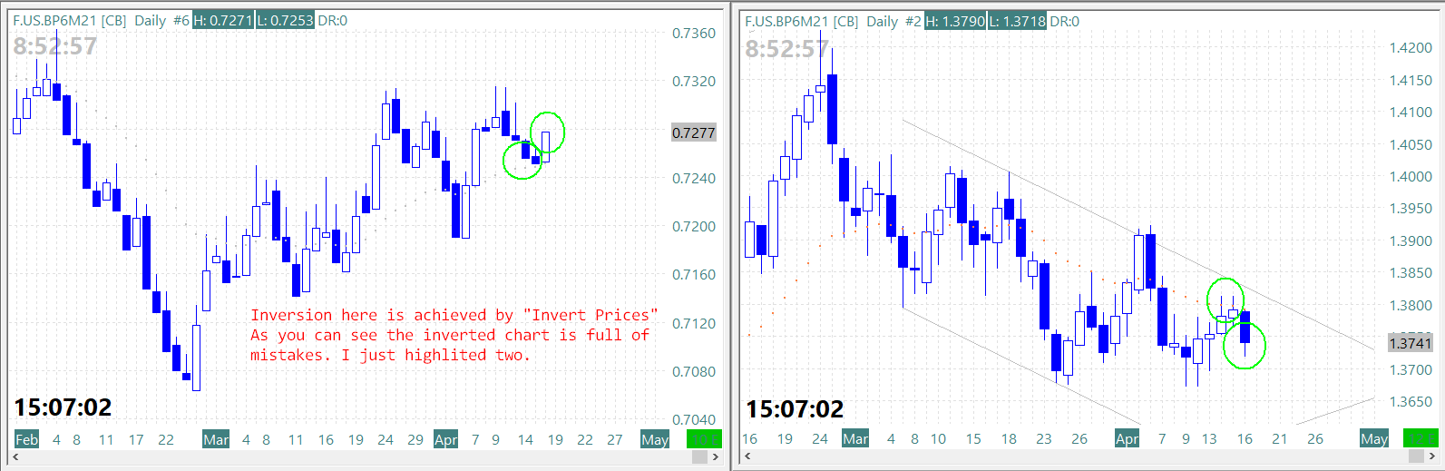 1) PRICE INVERSION The attached proves that the "Invert Prices" does not work. http://www.sierrachart.com/image.php?Image=1618560864733.png Similar problems can be found when using the Historical and Real Time multipliers set to "-1" Please if you decide to fix it >>> also add a keyboard shortcut for Inverting y-scale and reverting it back. Thank you! 2) SNAP TO PRICE SENSITIVITY. Yours snap works very poorly when the tick size is small compared to the average bar size. In that case I need to zoom the bar to make it huge to verify tool has snapped to OHLC. You need to make the sensitivity proportional to the average bar size as measured in ticks. A good snap to price can be found in TradingView. all the best |