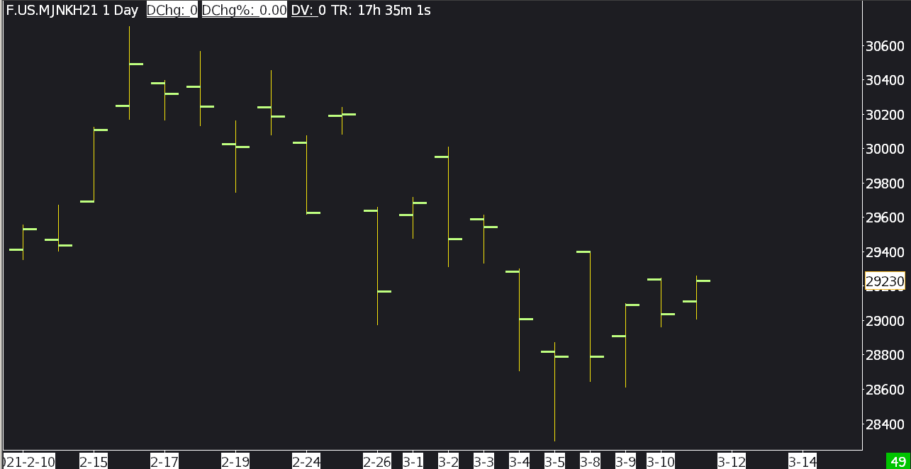 I purchased and loaded Mini Nikkei futures trade data from JPX. I converted the data to this CSV format: Symbol,Date,Time,Open,High,Low,Close,Volume F.US.MJNKH21,2020-12-30,07:30:01.046,27515,27515,27515,27515,393 The times are in UTC, and the formats are valid according to your spec. When I view the data using 5 minutes per bar (RTH or ETH), it looks great (see attachment). When I view the data as 1 day (1440 minutes), using RTH only, it looks great (see attachment). When I view the data as 1 day (1440 minutes), using ETH, it is very wrong (see attachment). Any ideas? I have manually examined the data and it appears to be fine. Date Time Of Last Edit: 2021-04-29 03:52:40