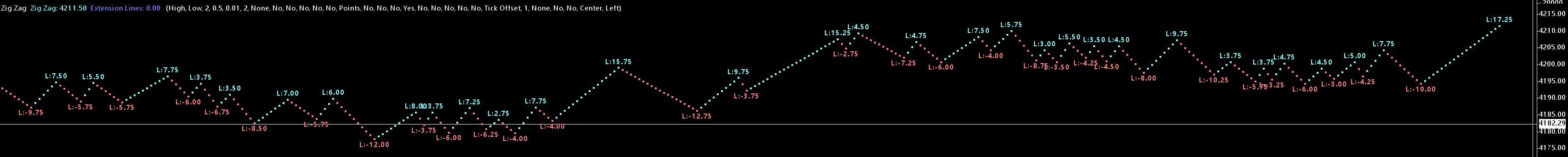 I am currently using the zig zag indicator in as subgraph to display the rotation value of swing high and lows. I have a few items I would like to change. 1) Y axis currently is based on price, can I have it based on rotation amount 2) Currently I can only start the chart for the top or bottom. I would like to have a middle 0 line to start drawing a bar chart. If the rotation is positive I would like to draw a colored bar and display the rotation value if a swing high above the 0 line and if negative draw a colored bar and display the rotation value if a swing low below the 0 line. 3) another nice feature if available is to draw a line above the 0 line indicating the average positive rotation and draw a line below the 0 line indicating the average negative rotation. I'm included two files, the first shows what I currently have and the second is what I would like to do. thanks. sorry if this is a duplicated but I submitted one earlier but it did not display |