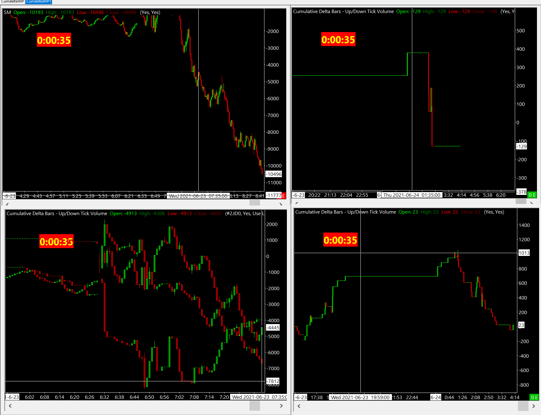 Hello, I need some help with the study/price overlay study. I'm trying to achieve a singe chart with 4 different lines of cumulative delta with varying volume inputs - the image below of the clean single chart is what I'm aiming for, and the image of the 4 bad looking charts is my work in progress. Ok, as for the specific questions: how do I get the labels on the y-axis? how do I make each chart start at the 0 value like in the image below as well? and how do I make the chart into lines instead of candlesticks like the chart image below? thanks for your time, it's really appreciated. |
