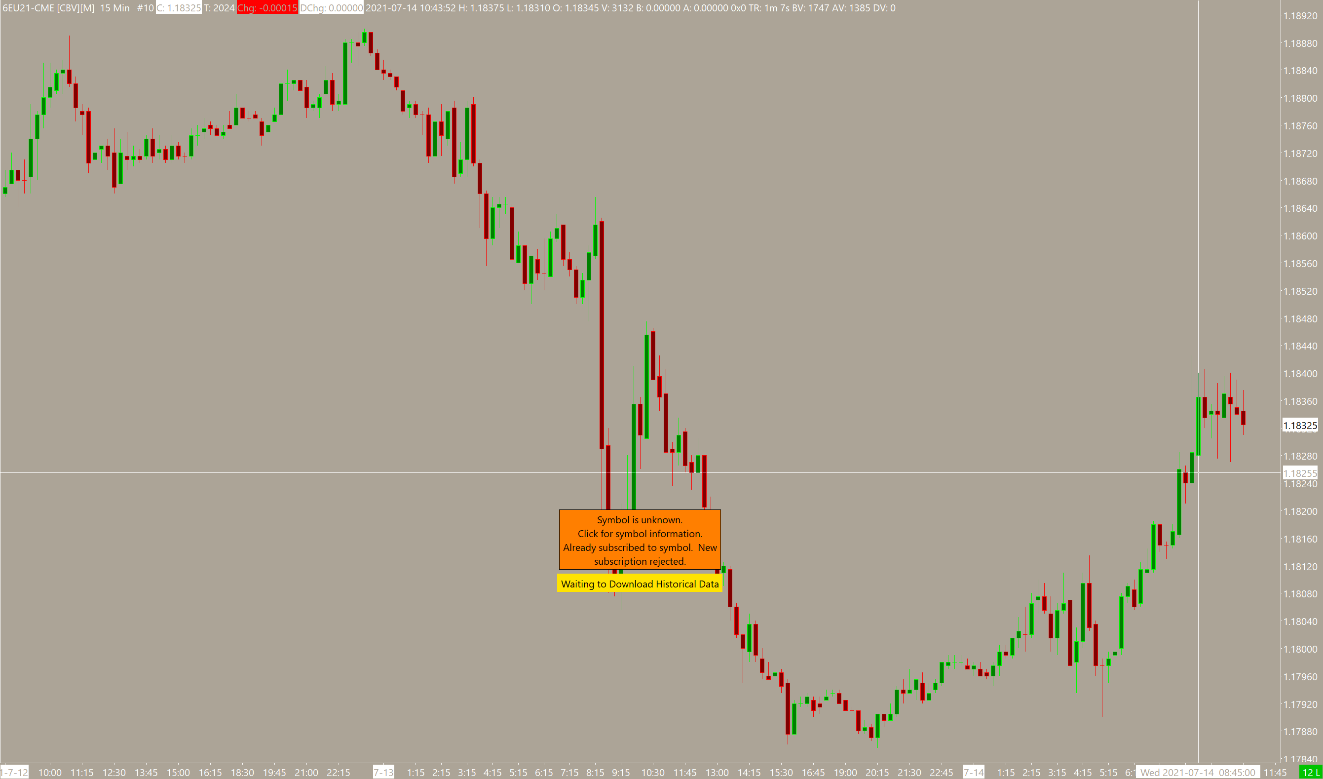 I am constantly receiving the following message in orange when first loading Sierra Chart. I completely rebuilt the chart book yesterday to see if that would fix it. I tried the translate symbols to current service function to see if that would help. After that, I deleted all data files so they are downloaded again. These actions did not help. Although eventually the message goes away, sometimes the chart does not update with any price changes and I have to disconnect and then re-connect for the chart to start updating. Then throughout the trading session I will need to disconnect from the data feed and reconnect as some symbols will stop receiving data and after reconnecting they begin receiving Realtime data again. I make sure I am scrolled all the current bar, which could be in the past if I did not notice that the chart stopped updating fast enough. Copied Errors from Message Log: Symbol Error - ESM20-CME is unknown, unavailable, or improperly formatted. Already subscribed to symbol. New subscription rejected. | 2021-07-14 10:29:25.510 Symbol Error - CLN21-NYMEX is unknown, unavailable, or improperly formatted. Already subscribed to symbol. New subscription rejected. | 2021-07-14 10:29:05.509 Symbol Error - CLQ21-NYMEX is unknown, unavailable, or improperly formatted. Already subscribed to symbol. New subscription rejected. | 2021-07-14 10:29:15.507 Screen shot of chart with no : http://www.sierrachart.com/image.php?Image=1626273963271.png Do you have any suggestions? Thank You. |