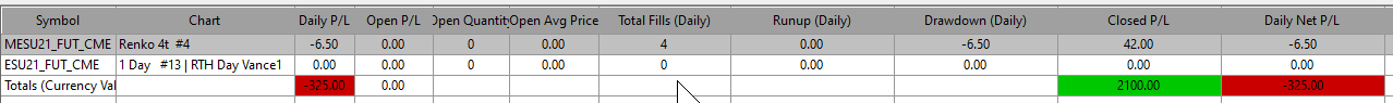 I took a 2 lot trade in the MES and had a loss. I was in at 4424.50 and got out way late at 4427.75, or 3.25 points. 1.25 tick x 2 lots x -3.25 points = -$32.50 Sierra's "Chart Stats" has me with 4 lots at -$350, as if I traded the Mini instead of the Micro. Reviewing the photo of "Chart Stats", it looks like I traded 4 lots, which I did not. The closed P/L is odd also. It was working fine the day before. I checked the "Chart >> Chart Settings >> Advanced Settings 2 >> Currency Value per Tick" and ensured it is set correctly. "Trade and Current Quote Symbol" is correct also. |