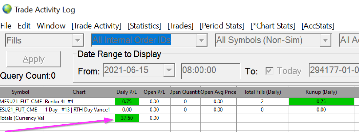 The exact name of the Chart Stats field I am referring to: Daily P/L I took a trade just now in the MES. I gained 3 ticks. It should read $3.75 but it reads $37.50. Off by a factor of ten. See enclosed photo. |