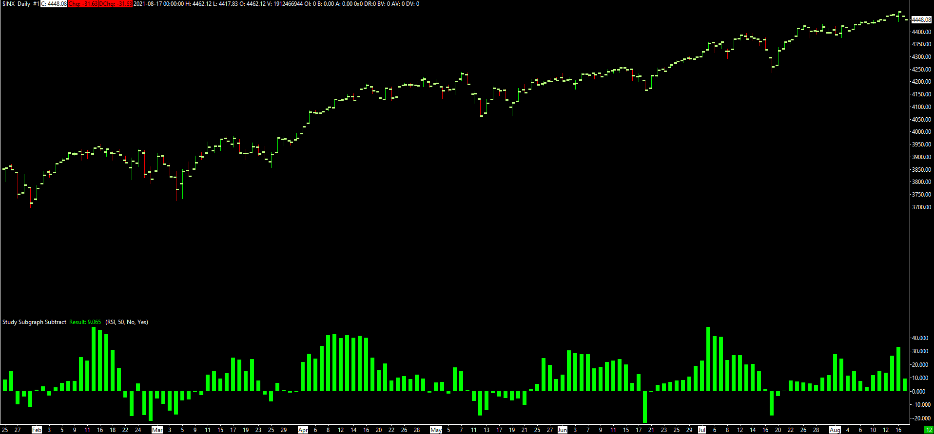 You can do this in Sierra Chart. Use the study called Study Subgraph - Subtract. Study Subgraph Subtract Apply this study to the same chart to which the RSI study is applied. In the Settings and Inputs tab for Study Subgraph - Subtract, do the following. * Set Based On to RSI. * Set Input Data to RSI. * Set Amount to Subtract to 50. Chart Studies: Settings and Inputs tab This will draw the Subgraph for RSI - 50. Then in the Subgraphs tab for Study Subgraph - Subtract, set Draw Style to Bar, and then click Apply. Chart Studies: Subgraphs Tab See the attached image for the results. |