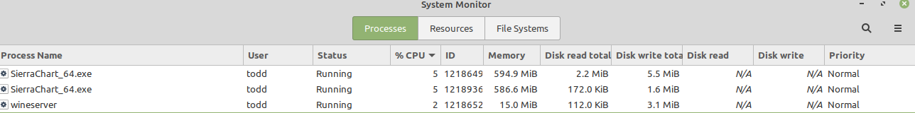 SC, Kernel and Wine updates all with no issues. Also, recompiled my custom studies with no issues. I recompile occasionally to ensure my code is up to date. Current configuration: SierraChart Version 2299 64 bit (2 instances) wine-6.15 Development Mint Linux 20.2/Cinnamon desktop Kernel 5.11.0-27 generic OpenGL X11lib: 1.7.0 AMD Ryzen 7 3800X GeForce GTX 1660 Nvidia video card w/6 GB GDDR5 and driver 460.91.03 Dual Monitors 1920X1080 60 Hz for both monitors Total System RAM: 16 Gig Memory usage: <600 Meg per instance. Total CPU Utilization: <=5% per SC instance 100 Charts, 7 instruments (ES, YM, NQ, RTY, GC, DAX, CL) Denali datafeed with MBO data CQG order routing Updated 8/27/21. Date Time Of Last Edit: 2021-08-27 20:00:04