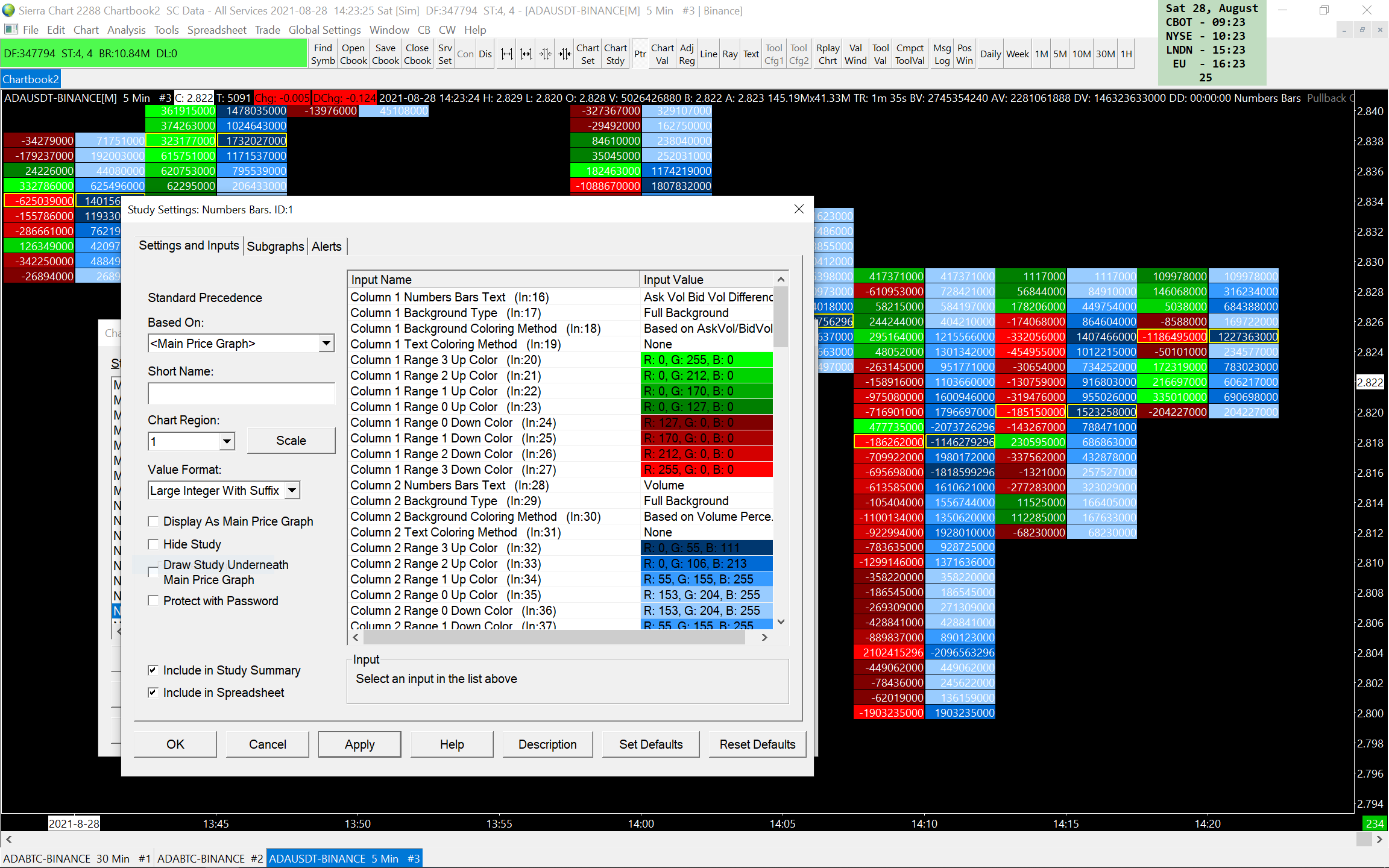 Trying to shorten the big numbers that appear with ADAUSDT pair on Binance using Numbers Bars Chart. I select "Study Settings => Value Format => Large Integer With Suffix" but nothing changes and the number stays as they were. Can also ask why in the second (blue) column where I have selected the values text to be volume the values appear to be negative? Negative Volume? how is that possible? http://www.sierrachart.com/image.php?Image=1630161737335.png Thanks for any help. Sergio |