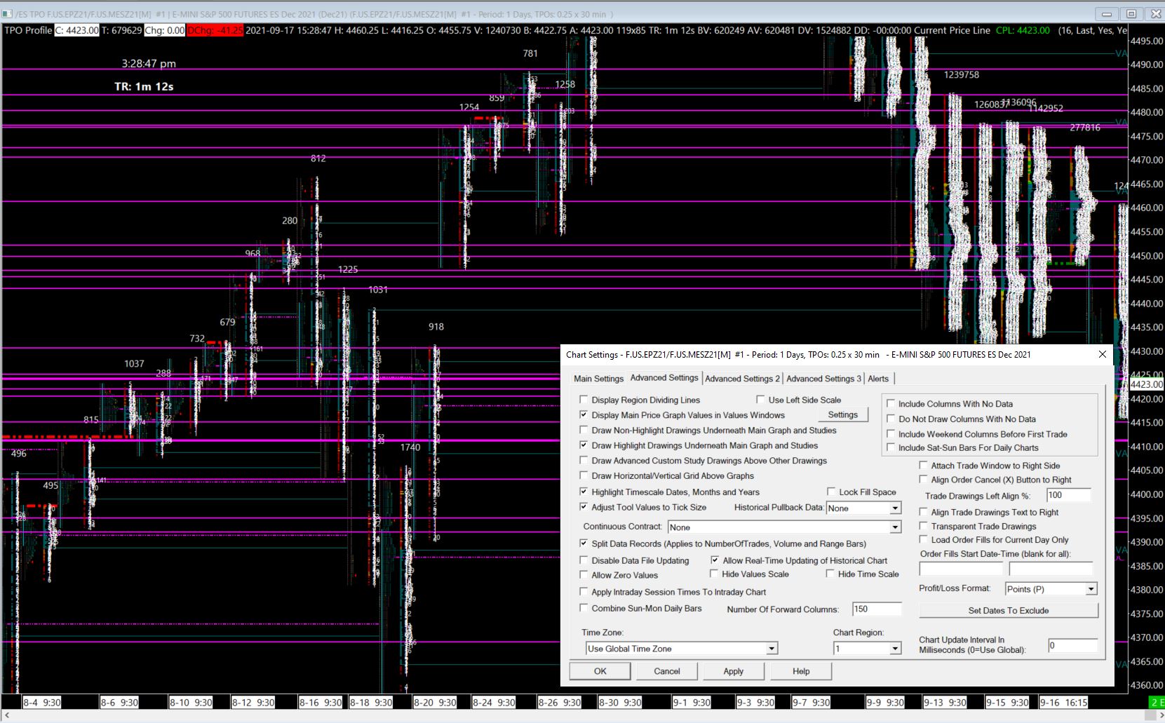Problem: TPO data missing for date range 8/6/2021 - 9/13/2021 (see "sierra support" image) Steps Taken: 1. Tried various Continuous Contract options. The dates are only visible when the selection is set to "None" 2. Deleted and downloaded data from beginning chart period (3/2/2021) 3. Created a new TPO chart 4. Performed Symbol Settings "Update From Server" Thank you for the help. Date Time Of Last Edit: 2021-09-17 20:13:46