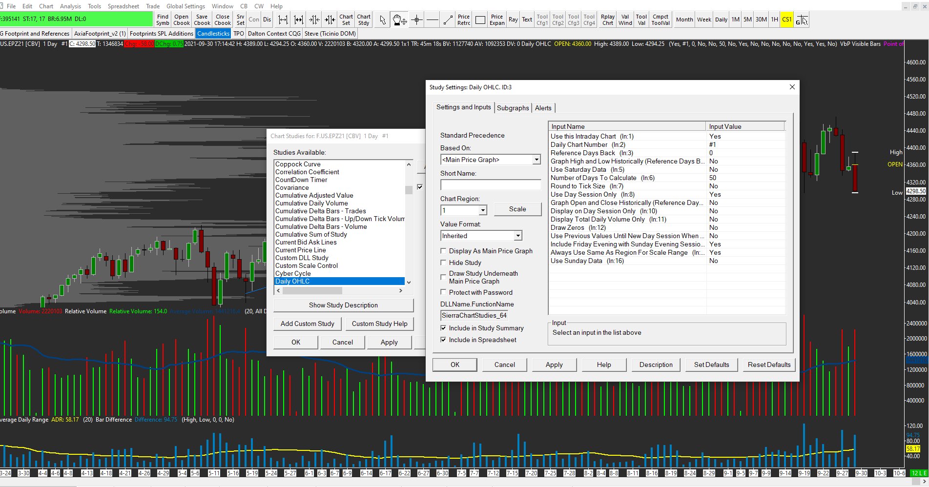 Not sure what to change the settings to. I set up a Daily candlestick chart with the Open, High and Low using Daily OHLC. I am attching the settings for that chart I then did the study overlay on the Trade DOM and am attaching the Settings I have for that I show a picture of the way I have the DOM comfigure with ES on the left and then MES on the right with the study overlay (which appears distorted). Any thoughts or suggestions would be appreciated Thank you very much Steven |