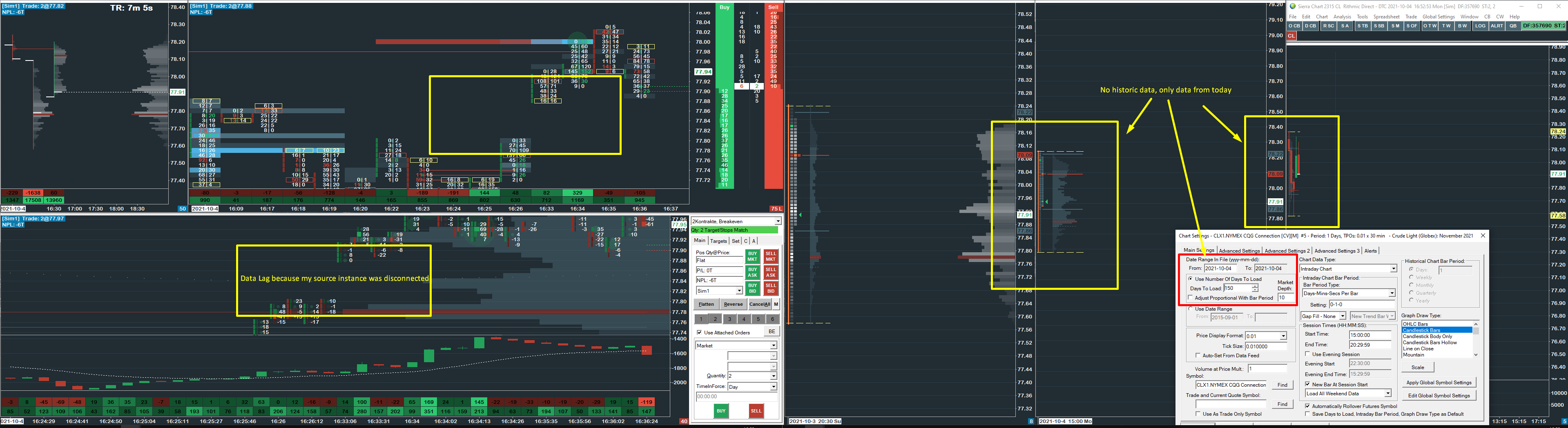 Hello, i try to get my Order Routing from Rithmic (Leeloo) and my market data from CQG, so i have 2 instances with different data service settings and different data files. I used the DTC Protocol Server to get my CQG symbols into my 2nd. instance with Rithmic login. The Real-Time Data works fine, but i got no historical data.. When i disconnect the CQG source instance and then connect it again, i got data lags in the destination instance. It is logic that the destination instance cant load data without the source instance, but why does the historical data do not fill up the data lags? And why i only get 1 Day loaded in the destination instance? Thanks. |