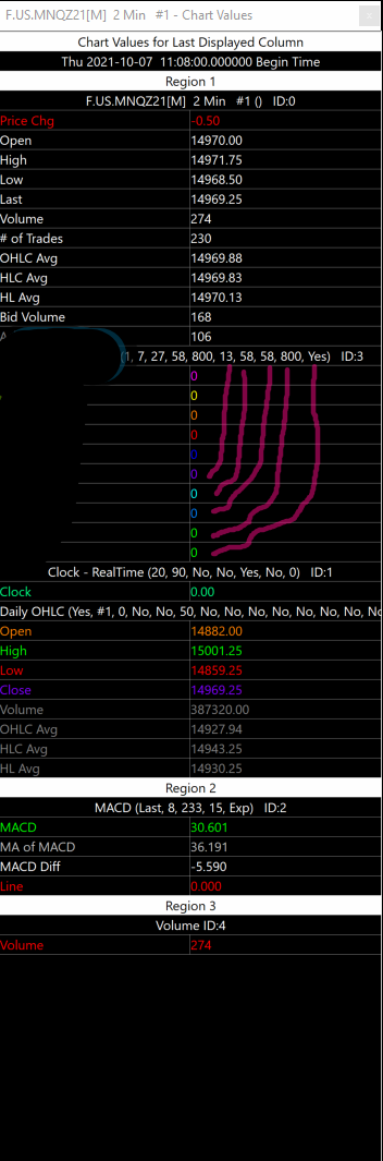 Hello, Newer ASCIL programmer. I cannot for the life of me find how to make sure that SubGraph inputs and values are displayed on the "Chart Values for Last Displayed Column" Window. Please see the attached screen shot. I would like the numbers in Parentheses displayed below to be in the colored areas. How can I code this? Thanks. |