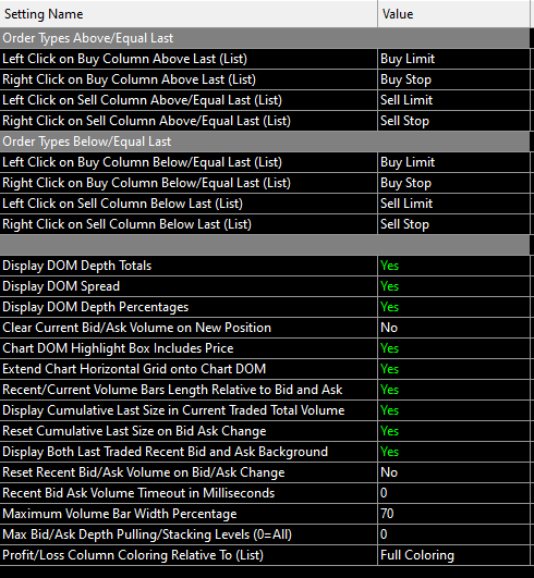 Hello! I want to see Market orders as they come in and keep a historical record of them as they hit the market. So for-example if the current price is 45.20 and there were 5 limit orders and 10 market orders. Instead of seeing a total volume of 15 I just want to see the 10 market orders. And as price moves up or down I want to keep a historical record of these market orders. I've been using Recent Ask Volume and Bid volume to accomplish this as it shows Market orders only I assume. But the numbers keep resetting. I found someone online whose didn't reset but I can't seem to replicate it on my sierra charts. I did go into Chart DOM settings and click NO on the reset recent bid/ask volume on bid/ask change. I've attached photos of my DOM my chart dom settings and what I would like to see. How do I accomplish this? Thank-you Bhupinder |