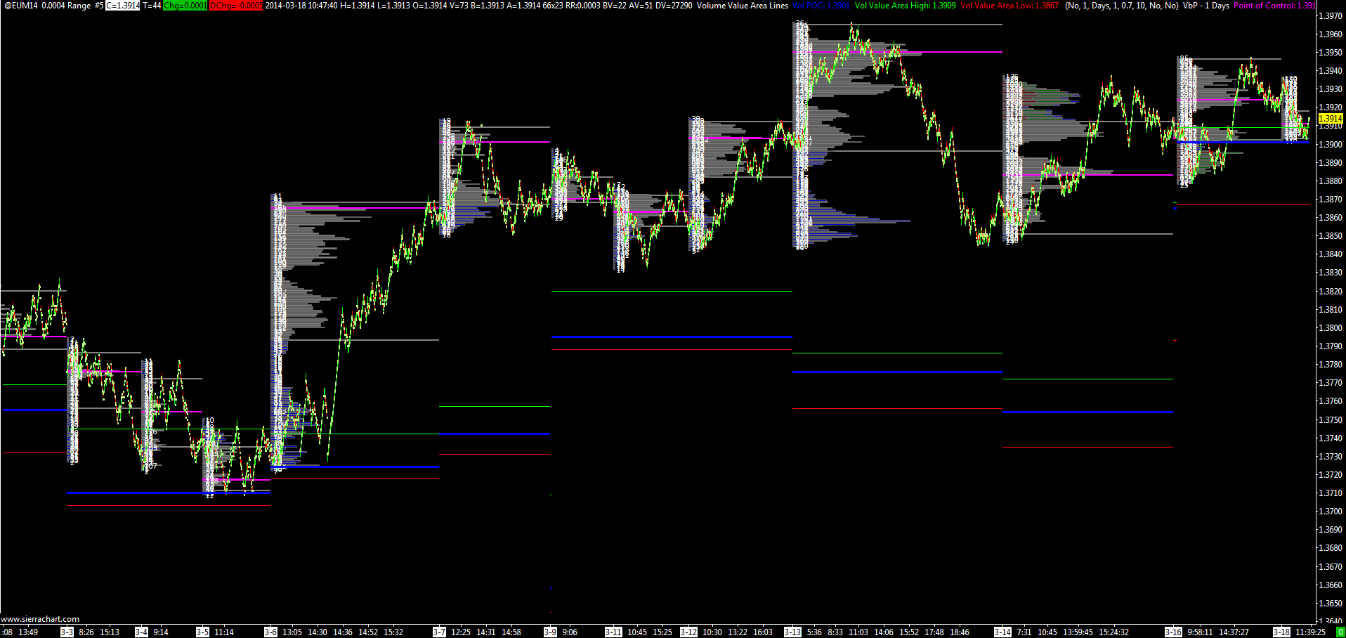 What is quite clear when looking at the attached screenshot is that it is doing something which is not what I have been asking for the past 6 or 7 messages, i.e, display the prior day's POC on today's chart. So today, we should see a line on today's chart at 1.3924, i.e, yesterday's POC. Can you see that? I can't personally. Can you see on yesterday's chart, a line at 1.3883, i.e, the day before yesterday's POC? Nope, still not. This is what I am traying to do, and this is not what the Value Area Line is doing. Is it? Date Time Of Last Edit: 2014-03-18 09:54:54