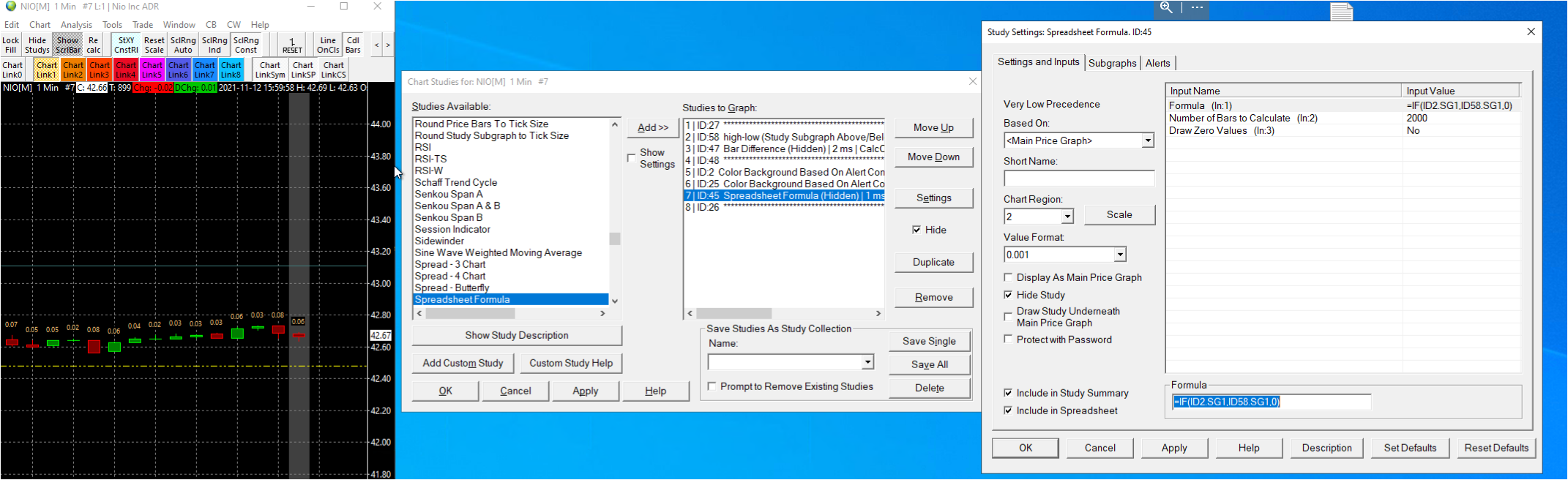 Hello, it doesn't work for me, because u ask for me to reference to the spreadsheet formula study,but my "Study Subgraph Above/Below Bar as Text study" study (id58) is already refer to another study (bar difference, id47),see in pic number 2 in the "spreadsheetformula" study i put the equation as u told me see in pic number 1 *id2 - where ID2 is the hidden color background study from post #2 see in pic number 3 Explanation: i want to see only the last bar data from "Study Subgraph Above/Below Bar as Text study" that refer to another study (bar differnce). what can i do to fix it ? regards |