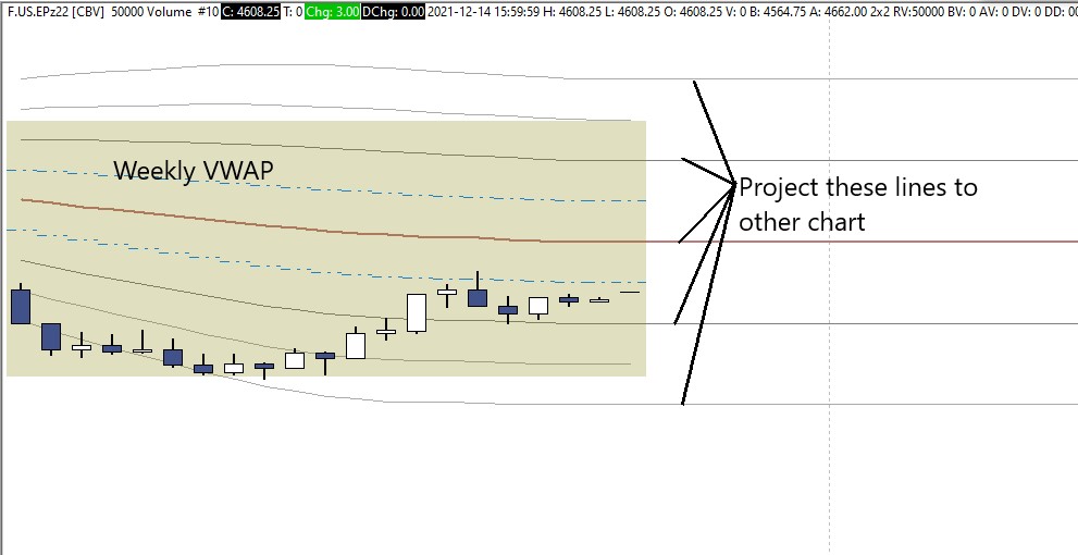 Hello, I use weekly VWAP on one chart and Daily VVWAP on a other chart. I would like to see the 2, 1, VWAP, -1, -2, deviation lines from the weekly VVWAP displayed as straight lines on the chart with the daily VWAP. How do I do this? Illustration picture attached. Thanks. Steffen |