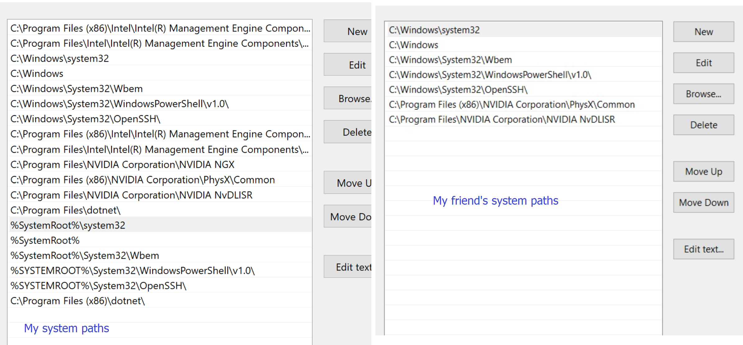 Thank you so much User972769, Following your steps: 1) On my pc (where the indicators work) I do not have the dll located here but just to be sure I had him try it on his computer. In the log the only difference was an error message that there was no version number for that dll file. I am guessing Sierra is thinking this is a custom indicator rather than the library for another one so it is trying to open it as such. Since things are working on my end without the file here I am thinking this is not the issue. 2) I looked at my system paths and compared to his. I am attaching a screenshot showing both. We both have Windows/system32 (one of several places where the dll is located as we tried to put it where it might be found by Sierra). The others seem to be application specific. Do you know if there is a way to find out where Sierra is looking for it? It seems to me that #2 is the likely problem since it works fine on my end but not on his, however as best I can tell he has the dll in the same locations that I do. |