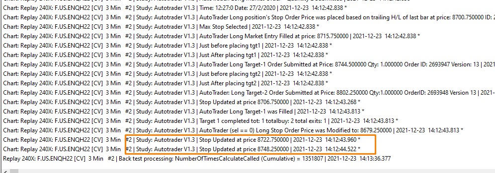 The results are correct till 120X but it is incorrect at 240. At 240X the study gets stuck and doesn't work properly. What could be the cause of it and how to fix it. The code how we update the stop loss is provided below: void StopUpdate(int OrderId,int StopUpdateStatus,float offset,float MaxStopPrice,SCStudyInterfaceRef sc) { if( StopUpdateStatus == STOP_UPDATE_NONE ) return ; s_SCNewOrder ModifyOrder; ModifyOrder.InternalOrderID = OrderId; s_SCTradeOrder mktStopDetails; if (sc.GetOrderByOrderID(OrderId, mktStopDetails) && mktStopDetails.OrderStatusCode == SCT_OSC_OPEN) { if( StopUpdateStatus == STOP_UPDATE_HIGH) ModifyOrder.Price1 = min(sc.High[sc.Index] + offset , MaxStopPrice); else if(StopUpdateStatus == STOP_UPDATE_LOW) ModifyOrder.Price1 = max(sc.Low[sc.Index] - offset , MaxStopPrice); else if(StopUpdateStatus == STOP_UPDATE_POC_LONG) ModifyOrder.Price1 = max(CalcPOCGeneral(sc,sc.Index) - (1 * sc.TickSize) , MaxStopPrice); else if(StopUpdateStatus == STOP_UPDATE_POC_SHORT) ModifyOrder.Price1 = min( CalcPOCGeneral(sc,sc.Index) +(1 * sc.TickSize),MaxStopPrice); SCString msg; if(sc.ModifyOrder(ModifyOrder) == 1) { SCString msg; msg.Format("Stop Updated at price %f" , ModifyOrder.Price1); sc.AddMessageToLog(msg,1); } else { msg.Format("STOP UPDATE Failed STATUS: %d",StopUpdateStatus); sc.AddMessageToLog(msg,1); } } } Here depending on the user setting we decide how to modify/trail the stop. Is it possible that the due to the replay speed the prices are moving faster than the update of the stop loss causing the issue and differences. How to do it so we get consistent results across all the relay speed Date Time Of Last Edit: 2021-12-24 11:00:29