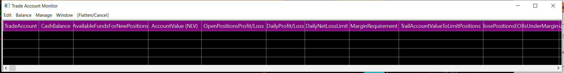 the goal is to have same balance window data as the evaluator when connecting to transact live Second Item: connected to TransAct and not getting the balance for your account Attached is pic connected to Transact WS Live Data When connected to the Trading Evaluator is displays all data correctly it is understood transact has to provide sierra the account data for this to work they may or may not offer this service If not would you know if Dorman Trading offer the data to sierra |
