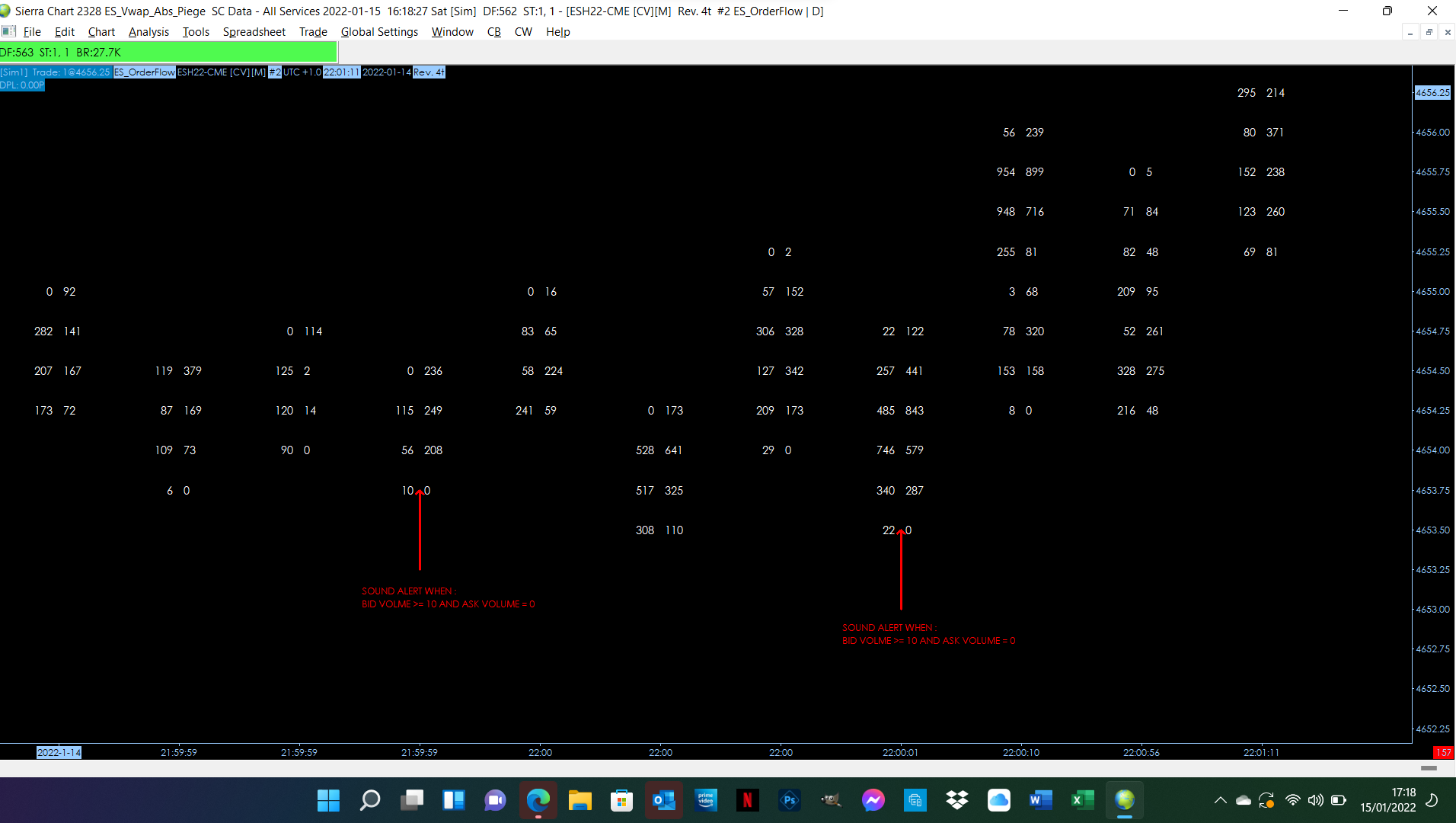 Hello, I would like to configure an alert when BID Volume >=10 and ASK Volume = 0 on ES Rev 4T ( see attachment). Could you please tell me how to draw a line if the condtion is reached. Thank you in advance. |
