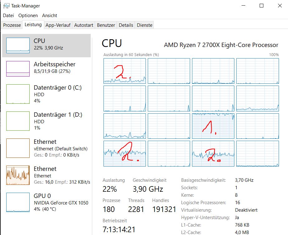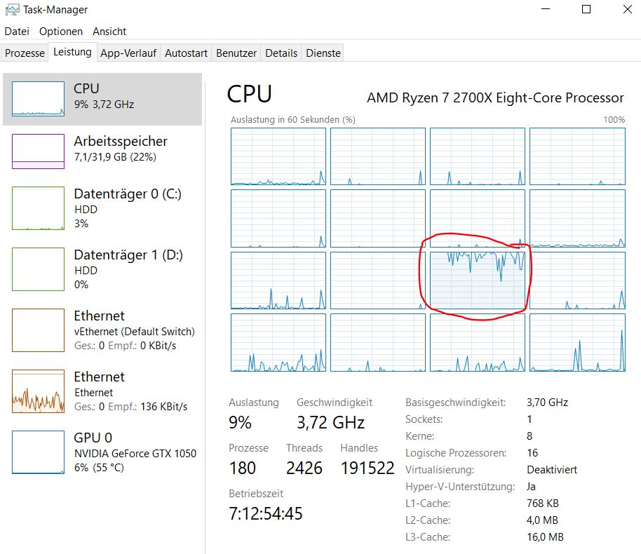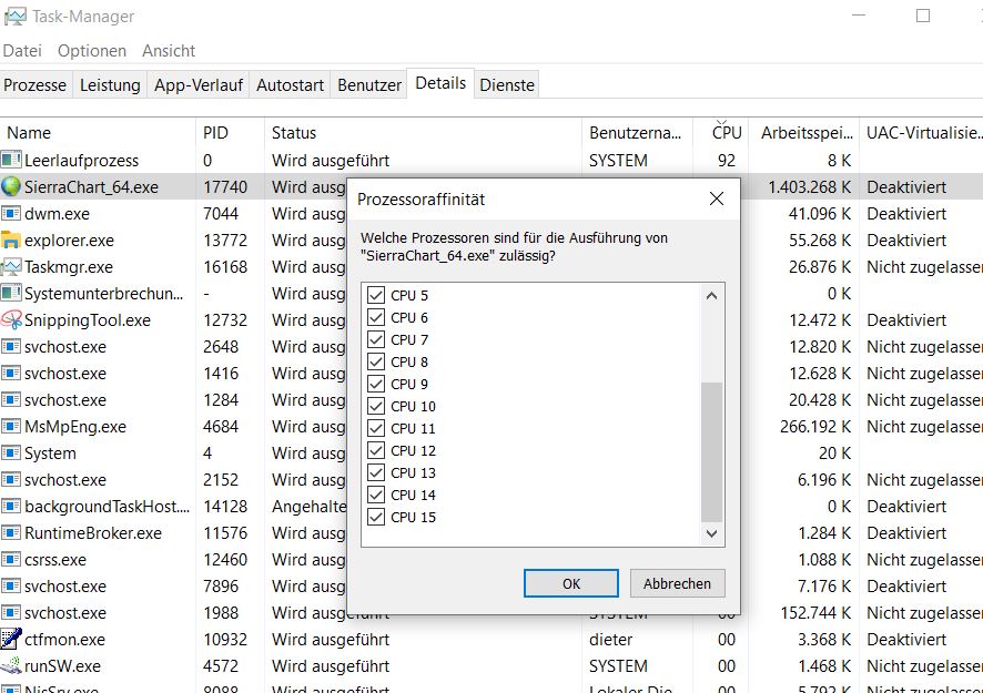 You have given me the answer on this treat: DOM lagging __________________________________________________________________________________________ Yes, Yes absolutely that is true! That should just be common sense. You cannot put more load, and expect no slowdown. You will absolutely have a slowdown. That is not a problem and is expected and is solved through using sub instances of Sierra Chart and adding more CPU cores to your system. I have the same problem. I used Jigsaw before this month. The more Sierra charts I open, the slower the doms become. Sim Account; Do not expect from us the impossible! This is something that you must solve on your side and you have more than the capability in Sierra Chart to do this. _________________________________________________________________________________________ I answer here: I will do the following tests: - Change the buffer size for the incoming data - distribute the charts of my one instance (84 pieces) to three instances. - some other performance tests A question to you. SC has 16 CPU cores available, runs in real time under Windows and initially only uses one almost completely - see attachments. How do you get SC to use multiple cores at once? If I start a second instance (2nd) after the first instance (1st), then the CPU load is distributed directly across multiple CPUs - see attachment Second instance distributed.JPG. Regards, DiWi |