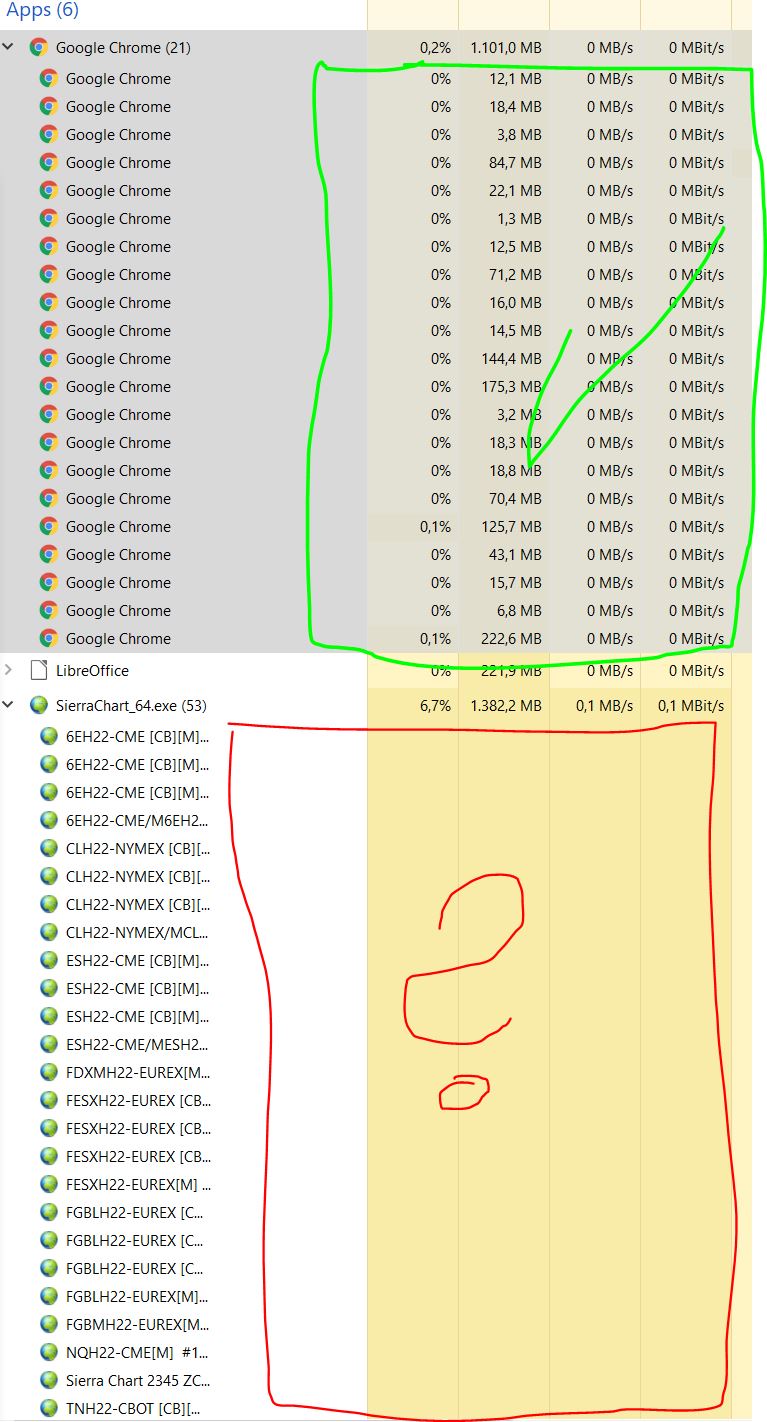 You have the time. I am already on version 2348. The next question: That's the only thing I can do here, all other data/settings are compared with live users and there are significant performance losses in this delayed sim trading vs. the live trading of other users: I can see no sup-prosesses in the windows task-manager for SC (sim account with delayed Denali) - see attachment. Is this a normal behaviour? If not, how can I change this! Here is the link to the video for the the above mentioned test: OK. I have done all my tests on sim. I compared the performance with my delayed sim trading with another trader who uses SC live. All settings for SC have been coordinated beforehand so that we have the same test conditions in all settings. Both use the same data feed. We added an ES dom to him and an ES dom to mine. The two videos then merged together. The result: Compared to my sim doms, however, the live dom is faster, which means that the number changes come faster and the transitions from price to price are smoother and more precise. In sim trading, the cumulative last price jumps from one price to another as described above. The dom skip about prices. The differences are there even if only one dom chart is open. From the above result, the question arises: Are there performance differences between delayed sim trading and live trading? In the vid you see 4 doms. You can see for all 4 doms the LAST Cummulative Price. On the left side is the dom from the live trader with one instance and over 200 charts. On the right side are 3 doms overlaped from my delayed 3 SC instances. The second of the 4 doms from the left has 84 charts in its instance. The third dom has 4 charts in the instance. The right dom runs alone on an instance. The last three doms run on a PC and are the sim delayed doms. All instances has the same global und chart settings. https://drive.google.com/file/d/1wijiGIMNS8ebXMyTIcJXEasK4AYZPobr/view?usp=sharing My planned setup is: - Plateform: Sierra Chart - Data Feed: Denali for EUREX, CME - CQG order-routing The problem is, if I go live with this performance (sim delayed with Denali data feed) on an AMD 2700X PC (16 treats), the CPU is used at 7% with an instance and 84 charts, then my trades will fly in my face. Regards, DiWi Date Time Of Last Edit: 2022-01-21 10:40:45