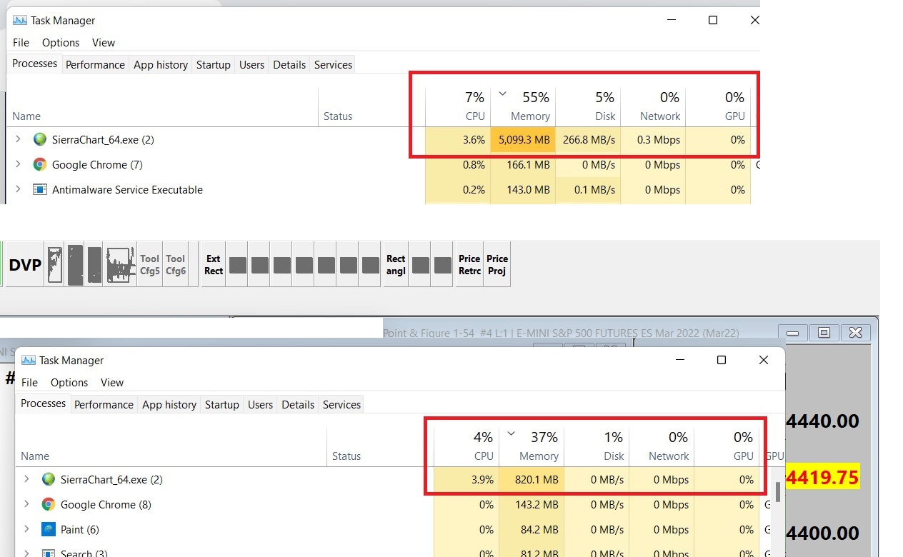 Hi Support, I still have issues with loading and high Memory usage. There are no issue with Windows Security or the Firewall. BUT Something happens when Sierra Charts is started. 1) When Sierra Charts is started, and the chartbook begins to load one instrument (ES), with 10 ES charts, all the charts load, except the 3 Point and Figure intraday charts. What I have to do is go to File/Disconnect, then the PnF starts to load (see attached jpg Loading ES chart) 2) Then, it takes about 8-9 minutes to load these 3 charts, (see attached jpg Loading ES chart) I thought the historical data was save to the hard drive so it doesn't have to reloaded at every Sierra Chart start up 3) Also 5-6 Gig of Memory is used (see attached Memory jpg) and the response time is slow. 4) Once all the charts are loaded and start to watch the DOM chart, the response time is very choppy, the price moves between ~ 4-6-8 ticks at a time. My trades are placed on this chart. This jumpy, laggy, sticky response time makes it totally impossible to trade. 5) After about 1-2 hours (see attached Memory jpg)the 5-6 Gig of memory drops down to 500-900 MB and the laggy, sticky response starts to improve but not like it use to be. 6) How do you minimize the Trade Service and Message log. Control-M works for a few minutes but the logs pop up within a few minutes and are also in my viewing area. I really what to resolve these issues and would appreciate your help. Kind Regards, Daniel Date Time Of Last Edit: 2022-02-05 17:53:23