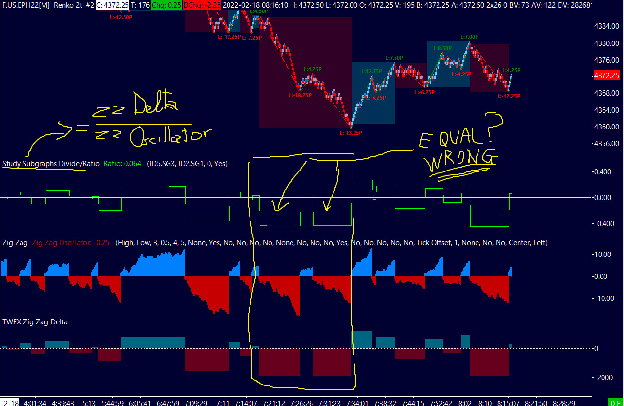 I'm trying to plot an indicator resulting from the ratio between 2 Study subgraphs indicators (Zig Zag Delta / Zig Zag Oscillator) I thought "Study Subgraphs Divide / Ratio" could be the solution, I've put it on but I see that is it non calculating correctly, manually checking the result it shows wrong, on the attached image you can see the evidence for the rotations considered: 2 different rotations (the first one is larger) and the 2 corresponding detla values (at the numerator) the Study Sugraphs shows 2 equally resulting values which is wrong. Do I miss something or I'm doing something wrong? Definitely I want to do a very simple thing, divide (for the same rotation) the Delta with the lenght of the rotation... Tks for the help Regards R. |