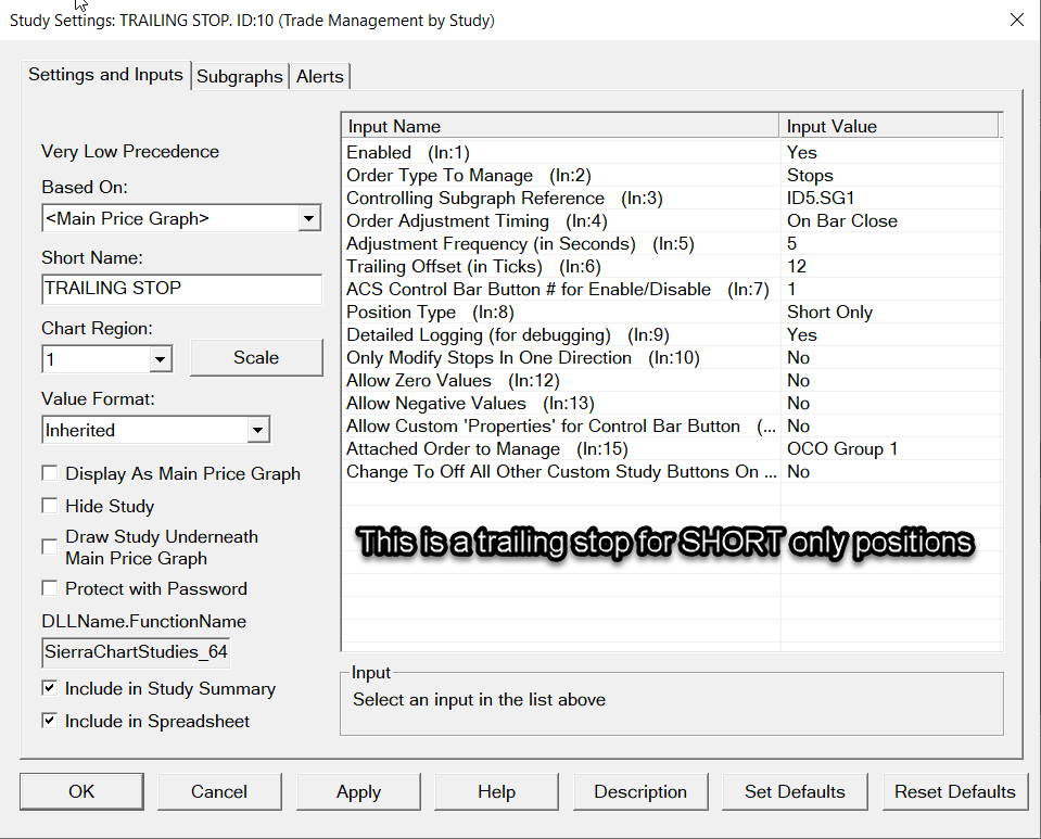 Thanks for the quick reply. #1 TIF I changed from Day to Good till Cancelled. #2 I had to add "Send Attached Orders by Price/Position" to the chart trade menu in order to send a bracket order for a live order. However, this did not solve the issue with the Trade Management by Study working with this new bracket order. I tested this by cancelling the existing working orders for a live order entered with an attached order. I then manually used Send Attached Orders by Price, which worked, but now I'm getting a slightly different message in the message log (see below). And it is not trailing my stop like it does if it was a "natively" initiated attached order. Chart: ESH22_FUT_CME/MESH22_FUT_CME[M] Flex Renko 5-4-0 #8 | Study: TRAILING STOP | There is no Stop/Target Attached Order found. | 2022-02-22 13:38:20.919 Attached is the Trade Management by Study config screenshot. Date Time Of Last Edit: 2022-02-22 19:46:26
