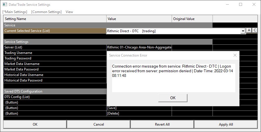 Hello, I am currently only receiving delayed data to my charts. I opened an account with AMP(Rithmic feed) to avoid having to connect Sierra to my "live" futures account once per month. Is this no longer a supported option? Also, I attempted to manually connect/disconnect to my AMP account without success. The attached image shows the message I have gotten. Regards. |