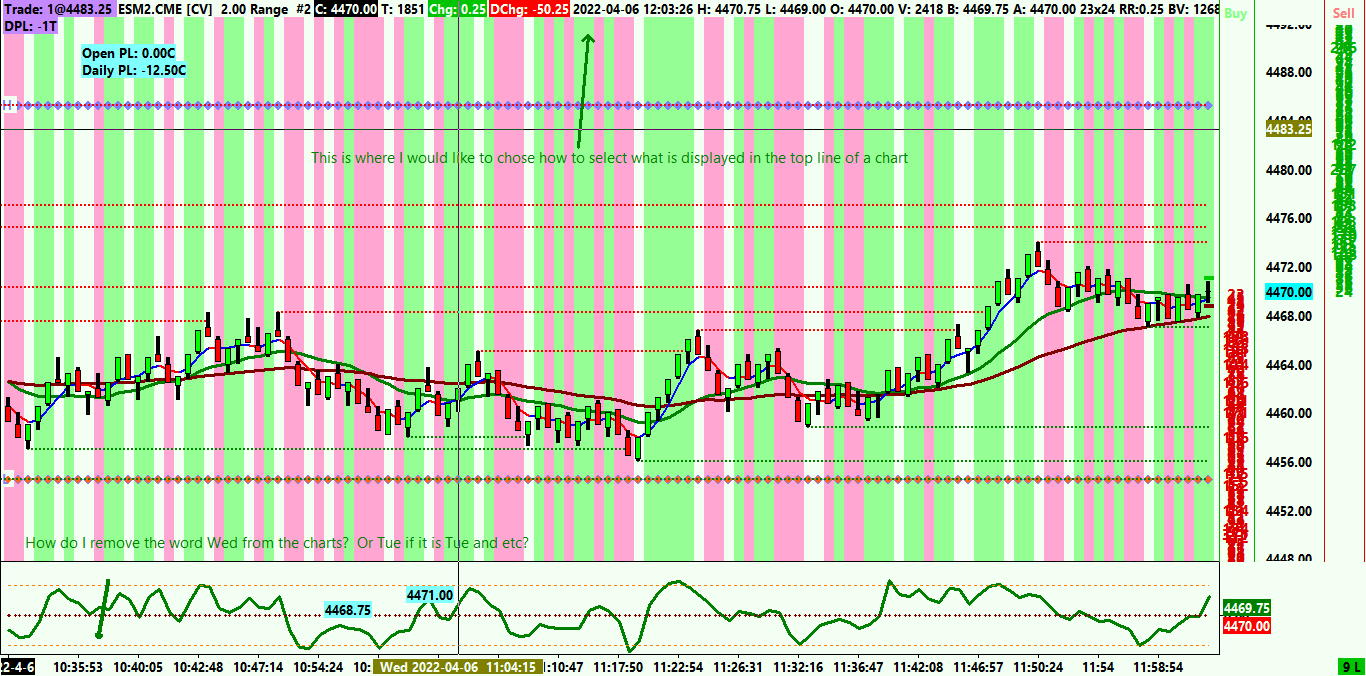 SC, 1. How do I chose what is displayed in the top part of a chart, like right now it shows the symbol but it is also showing O H L C BxA size and etc? 2. How do I remove day from the bottom of my charts. I want to keep the date and time but remove the day name....ie, keep 22-04-06 and the time 11:27:42 but get rid of the day name...like Wed or Thu or Fri, and etc. See the attached chart of a visual of my questions. https://www.sierrachart.com/image.php?Image=1649261008934.png I think Sierra Charts are the best. Thanks in advance. |
