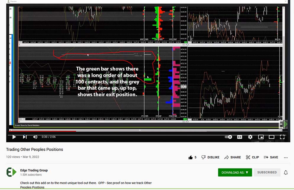 Hi. I am attaching two images of two different Chart Trading DOM's that I would like some options identified. The one image shows a setup from The Pit Futures Trading youtube channel. I am trying to figure out what the vertical bar is in the DOM that has red bars on the left and green on the right? The second photo is from the Edge Trading Group youtube channel. I am not sure if he is even using Sierra Chart, but the first vertical bar he has shows the red bars on the left and green bars on the right. In the picture the large green bar is an order for probably 100 contracts, at the same time the person's exit order also pops up above it as a grey line. Is this doable in Sierra Chart? If yes how? Also in other Edge Trading Group videos, he has Iceberg Lines. It is my understanding though that there is no data feed that tells anyone if an order is an Iceberg order or not. That said, I am guessing whatever software he is using is making an educated guess on it, thereby giving him a line where the Iceberg order is supposedly happening. Is this something that is doable in Sierra Chart? Thanks. |