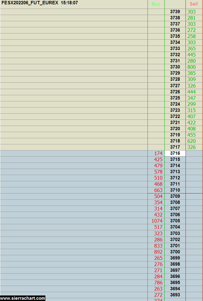 We cannot do anything about the discrepancies due to the nature of the EOBI data feed. That will have to wait until tomorrow until we have a fresh connection and a new order book. It is not possible for us to do anything now if things have gone wrong on the EUREX T7 side and faulty or incomplete data has been provided on the T7 feed, aassuming that even happened. The market depth to us looks perfectly fine. There are no overlapping levels: https://www.sierrachart.com/image.php?Image=1649855893657.png Sierra Chart Support - Engineering Level Your definitive source for support. Other responses are from users. Try to keep your questions brief and to the point. Be aware of support policy: https://www.sierrachart.com/index.php?l=PostingInformation.php#GeneralInformation For the most reliable, advanced, and zero cost futures order routing, *change* to the Teton service: Sierra Chart Teton Futures Order Routing Date Time Of Last Edit: 2022-04-13 13:20:24