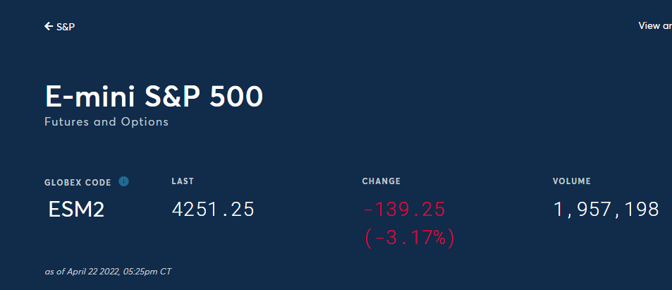 Hello Today, 04/22/2022, at approximately 16:00 PM EST, I noticed on my ESM22-CME chart and Quote Board the Daily Change % and Daily Change fields reset to zero and continued their updating until the market close at 17:00 PM EST. The final closing values on my ESM22-CME chart and Quote Board are as follows: Daily Change % -0.37% Daily Change -16.00 The final closing values from https://www.cmegroup.com/markets/equities/sp/e-mini-sandp500.contractSpecs.html for 04/22/2022 are as follows: Daily Change % -3.17% Daily Change -139.25 The Symbol Settings for ES?##-CME are as follows: Time Zone: New York (-5 EST / -4 EDT) Session Start Time: 09:30:00 Session End Time: 17:00:00 Evening Start Time: 18:00:00 Evening End Time: 09:29:59 The Chart Settings for ESM22-CME are identical to the above symbol settings values. Are there any other parameters I may have missed which would cause this anomaly? Thank you in advance for your support. Warmest Regards Andy |