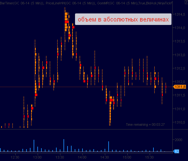 When I apply Number Bars or Volume by price studies to each bar within the chart, I see that each bar has its own, independent of other bars, scale for drawing volume profile, for example: if one bar has max cluster volume 200, and other bar 20 - width of those clusters within the bars on the chart will be equal. So my question is - how can I(and could I at all?) make chart with profiles of the each bar, but width of each cluster in profile will depend on absolute volume - that cluster in one bar with volume 200 will be 10 times wider cluster in other bar with volume 20. PS Currently I use Ninja with GOMP indicator which allows me to change global scale for absolute cluster volume by pressing +/- keys, making clusters thinner or thicker. But anyway - having a glimpse of my chart, I always can differ 200 cluster and 20. Attached files are screenshots of the same situation in sierra and ninja. Date Time Of Last Edit: 2014-04-09 21:52:59