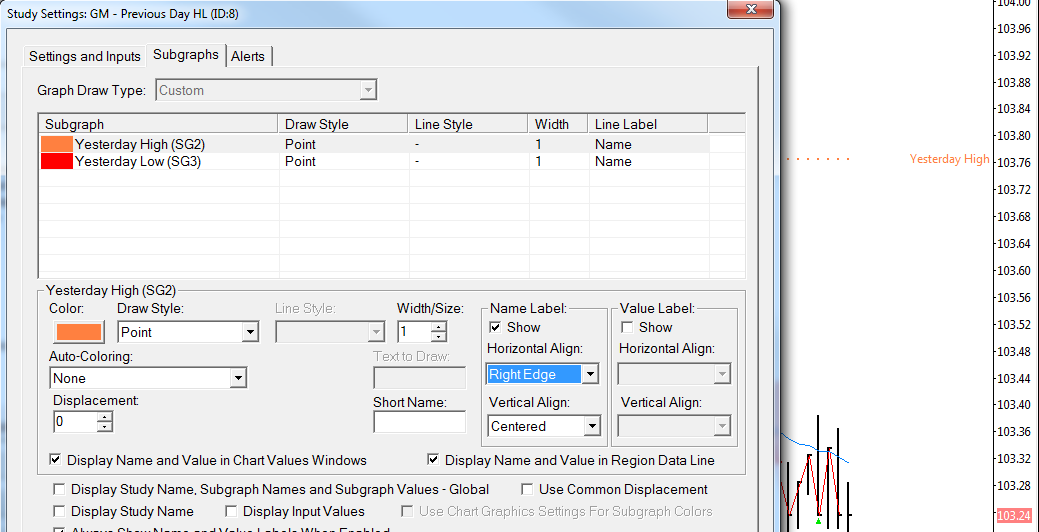 Using the Daily OHLC study you can set the line label to align to the right edge. I'm developing my own study and would like to align the text to the right edge, however the study documentation makes no reference to right edge alignment, only left edge alignment: http://www.sierrachart.com/index.php?l=doc/doc_ACSIL_Members_scSubgraph.html#scSubgraphLineLabel When I try to compile with LL_NAME_ALIGN_RIGHT_EDGE it fails. Can this option be added to the Line label functionality from a coding perspective? Thanks |