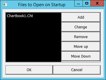 It sounds like you are doing the correct things. The first thing we want to make sure of is that you are actually selecting the button that is labeled [Select Chartbook to Open on Startup]. You need to actually click on that text that has that statement. Refer to the instructions for this type of element here: Settings Windows Interface: Button (Working with Sierra Chart Windows >> Selection Specific Options) When you select the button you should get a window that looks like the one in the attached file name ChartbooksToOpenOnStartup. If you are not getting this window, then select Windows >> Reset Windows. Then select the button again and the window should show up properly for you. If you continue to have issues, let us know. For the most reliable, advanced, and zero cost futures order routing, use the Teton service: Sierra Chart Teton Futures Order Routing |