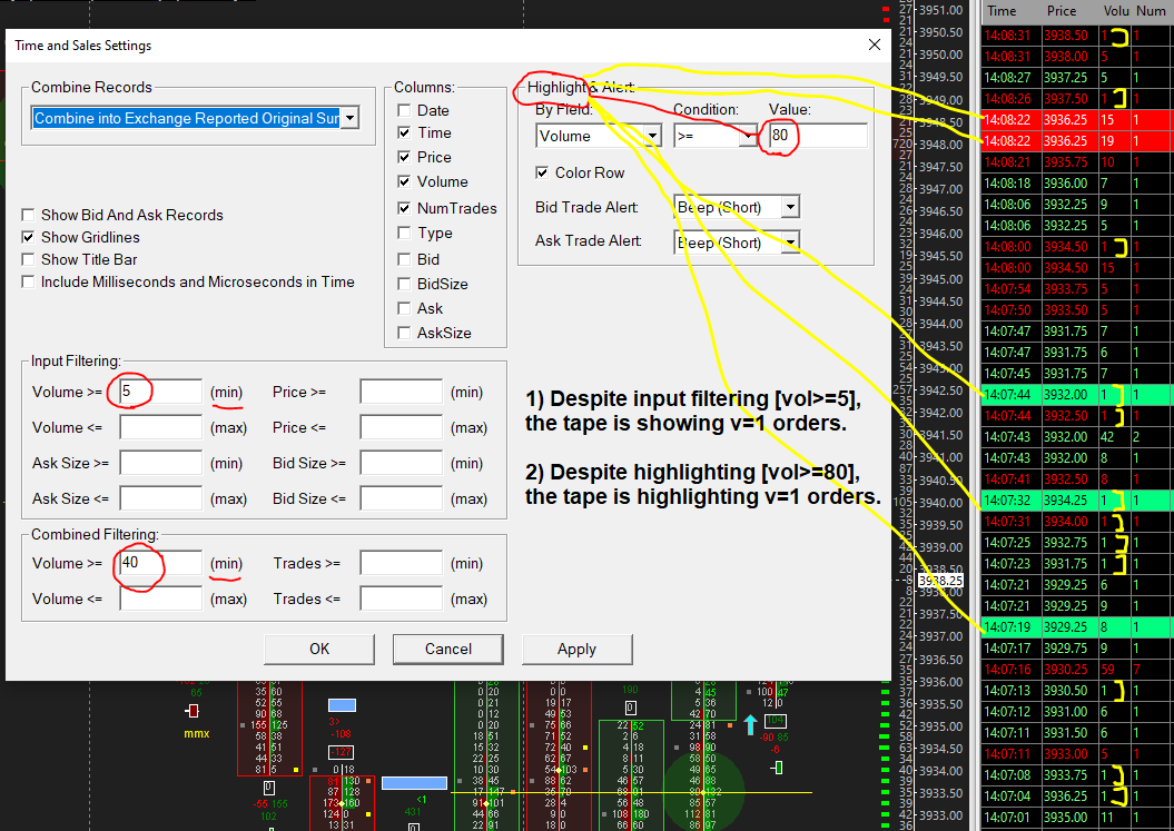 Dear Support - The tape (time and sales) is not respecting filter rules; please fix or explain. In the attached sample from today's RTH, you can see at least two problems: 1) Random orders with volume quantity 1 show on the tape, despite volume filtering of v>=5 and consolidated filtering of v>=40 2) Some of the volume quantity 1 orders are highlighted, despite the v>=80 highlighting rule. Please assist with resolving this issue - thank you in advance. |